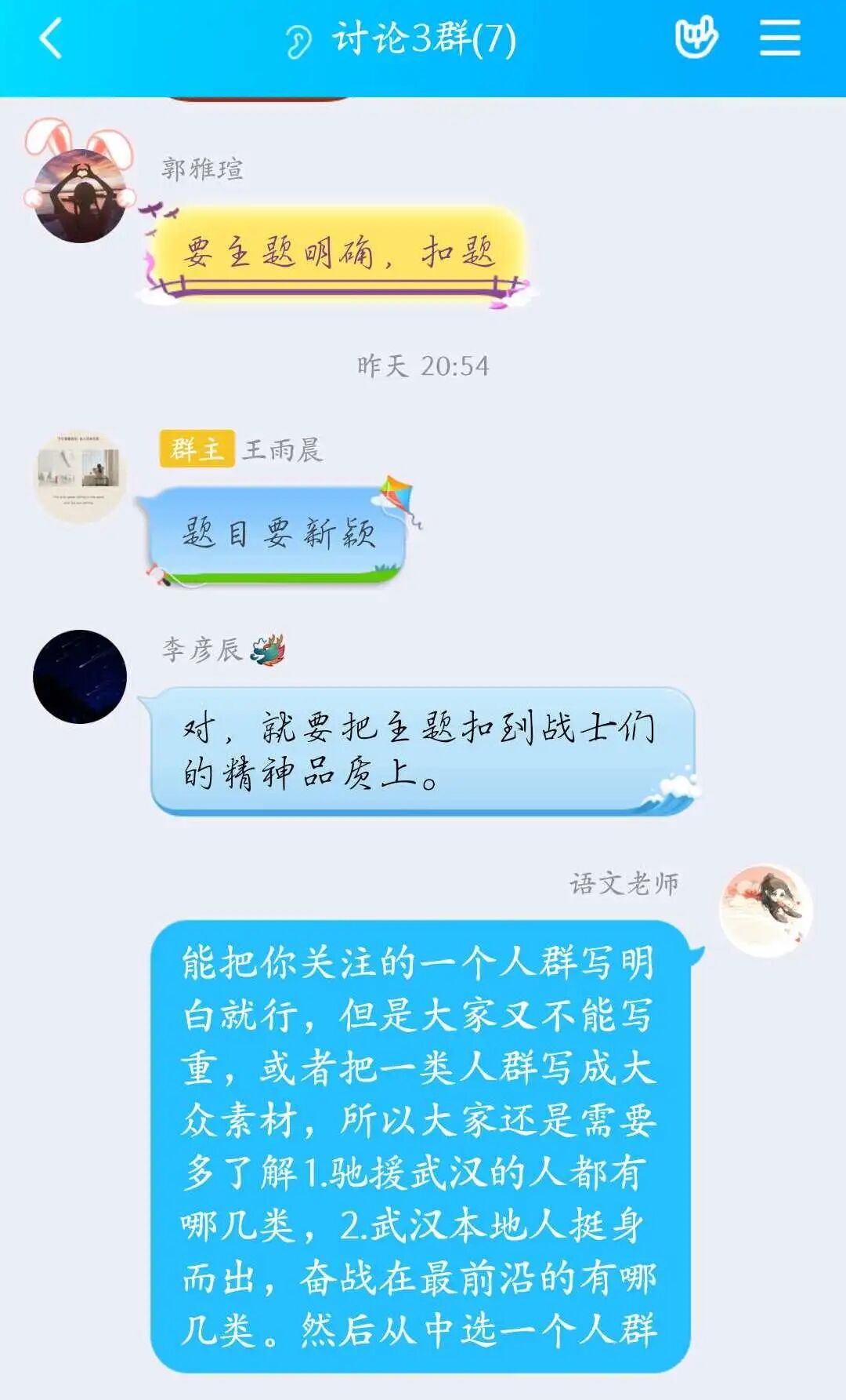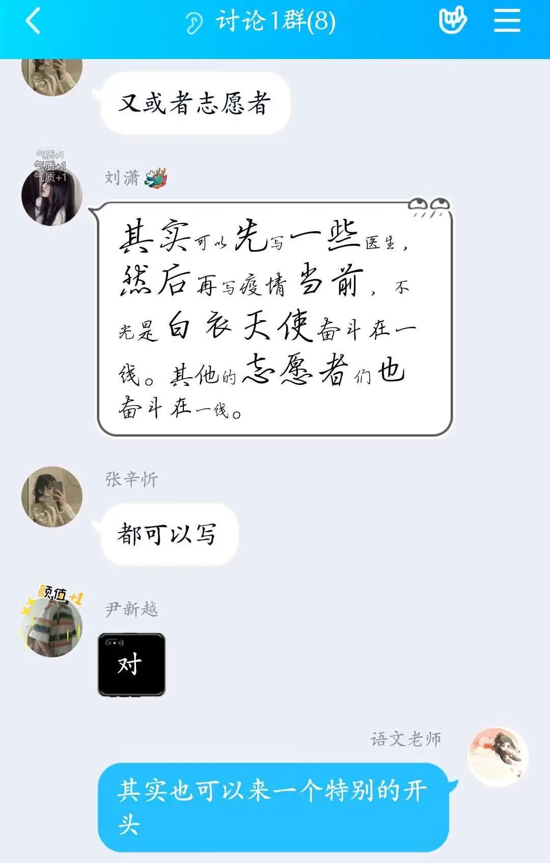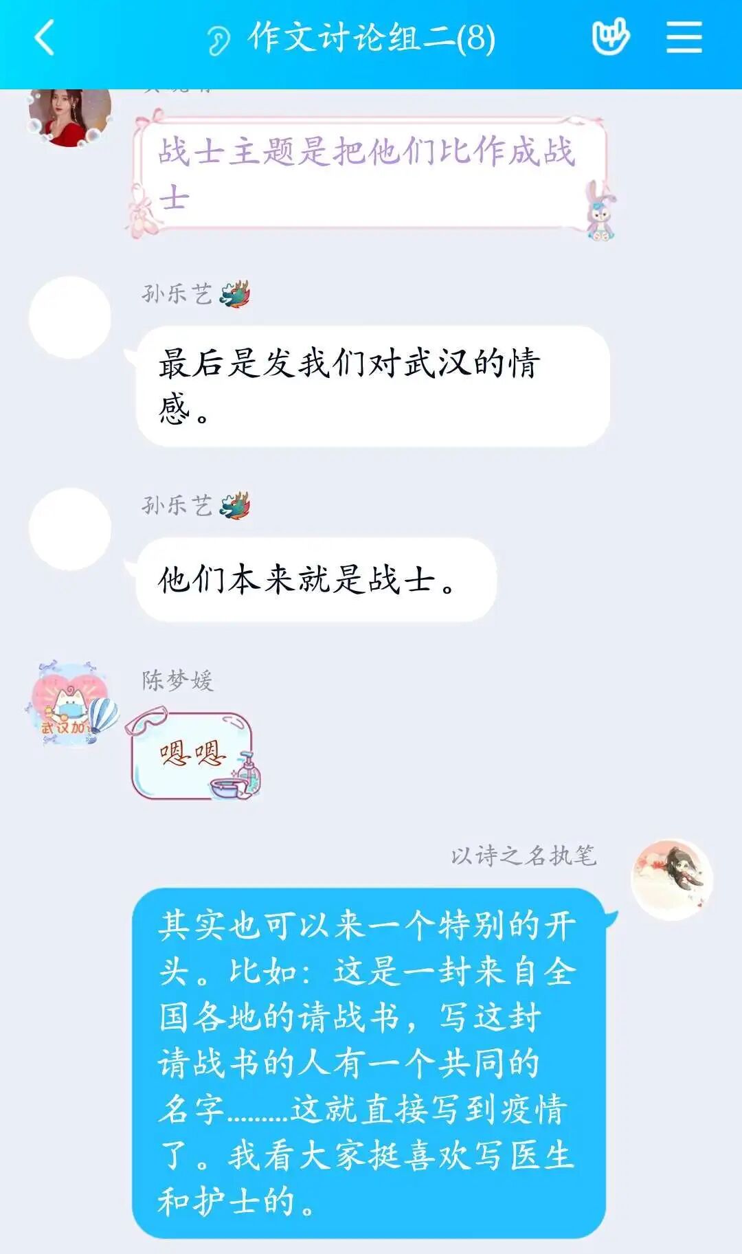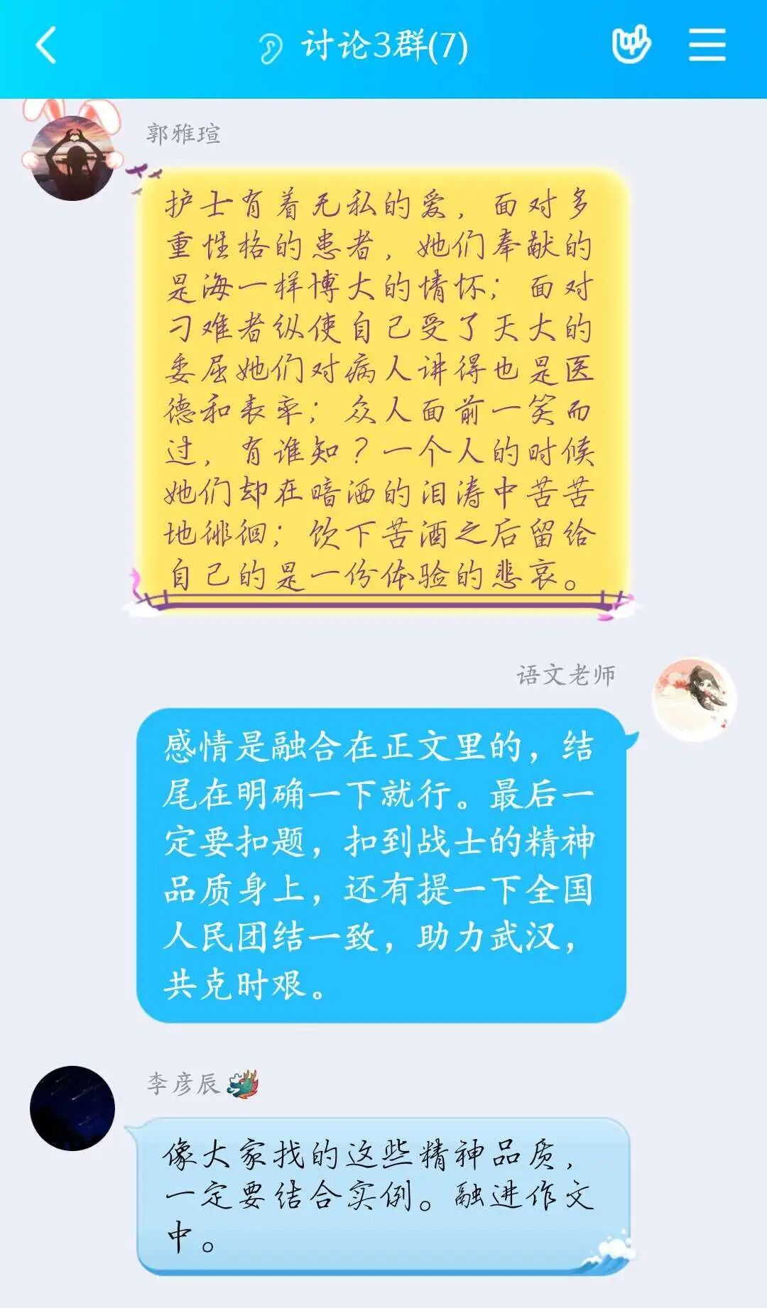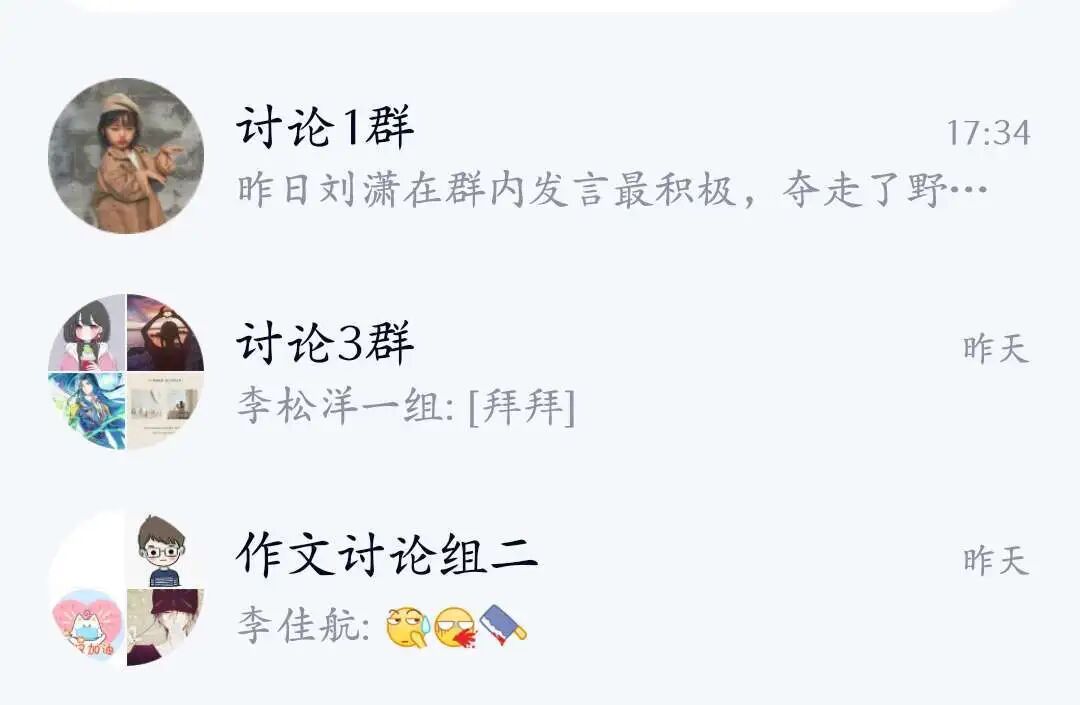 对于写作的学习,我的建议是建一个学生讨论群,建群的当天群里就讨论得热火朝天。自此,每天的最后一节自习过后,另一处学习角,就是学生们兴趣学习的小世界。老师给出一个作文主题,同学们写作文发到讨论群里传看、讨论,有时还可以来个语音讨论,大家畅所欲言。