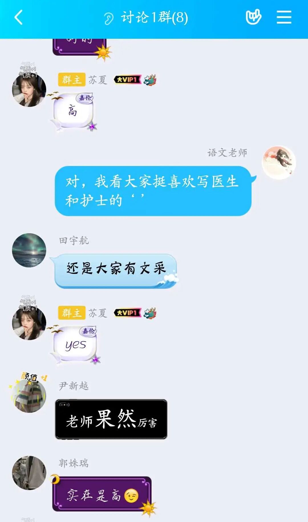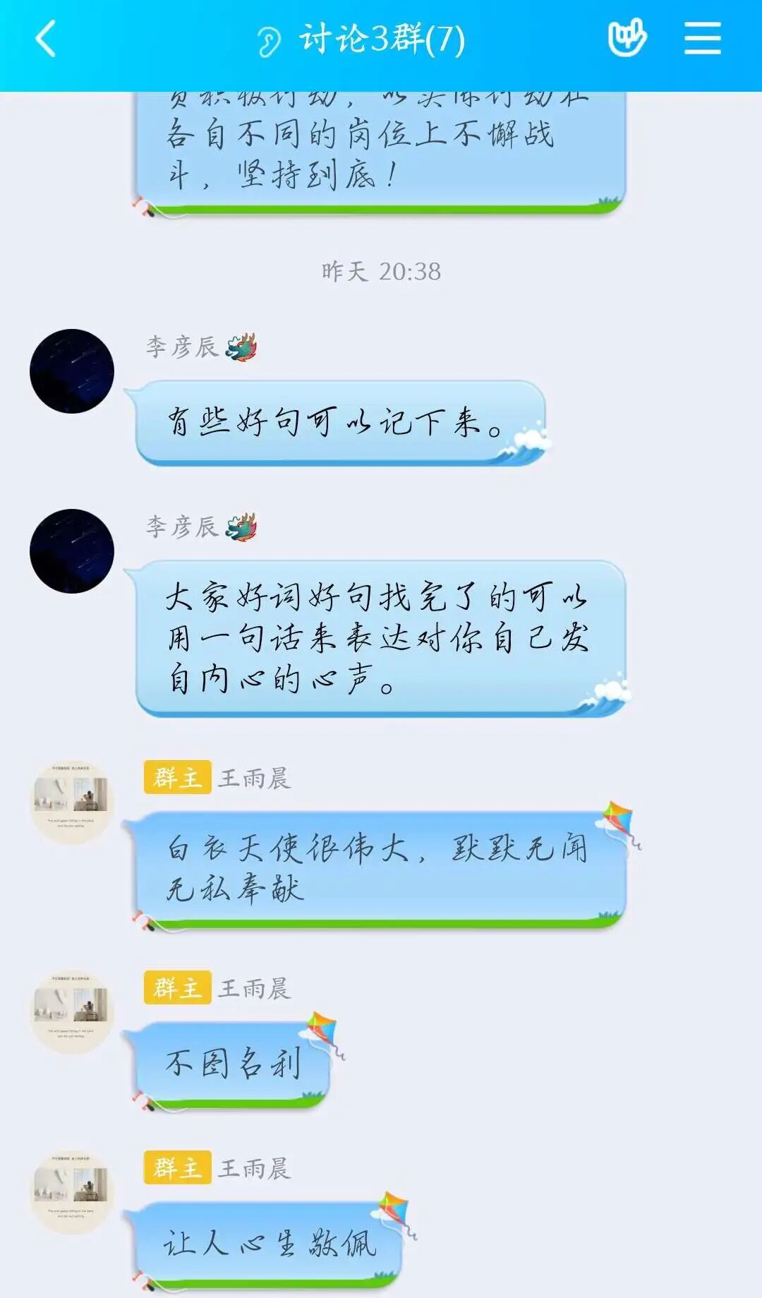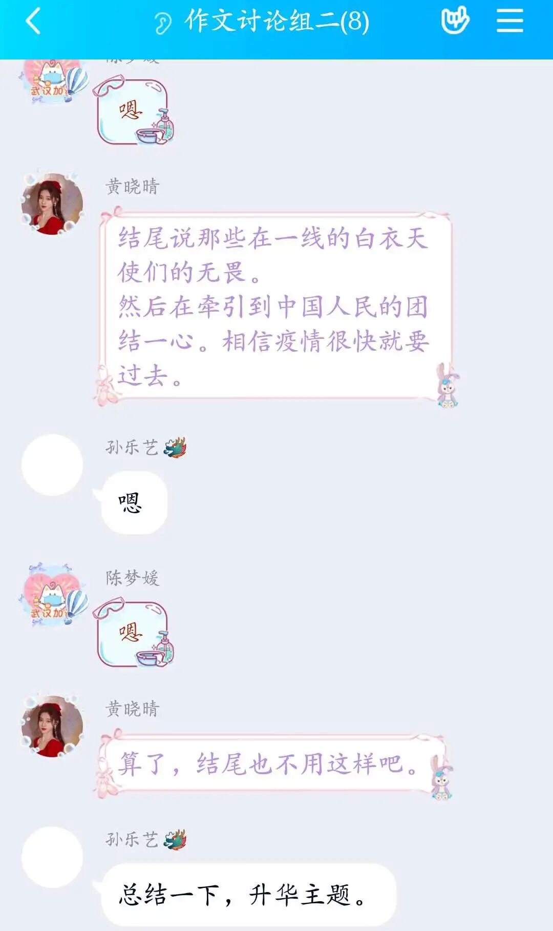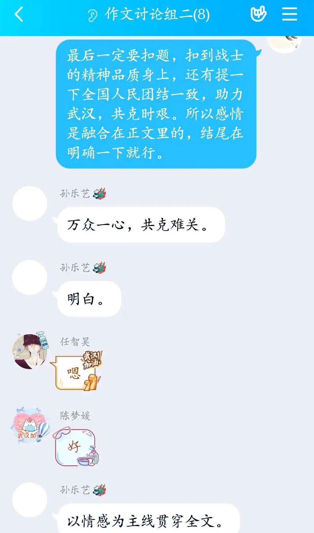 对于写作的学习,我的建议是建一个学生讨论群,建群的当天群里就讨论得热火朝天。自此,每天的最后一节自习过后,另一处学习角,就是学生们兴趣学习的小世界。老师给出一个作文主题,同学们写作文发到讨论群里传看、讨论,有时还可以来个语音讨论,大家畅所欲言。