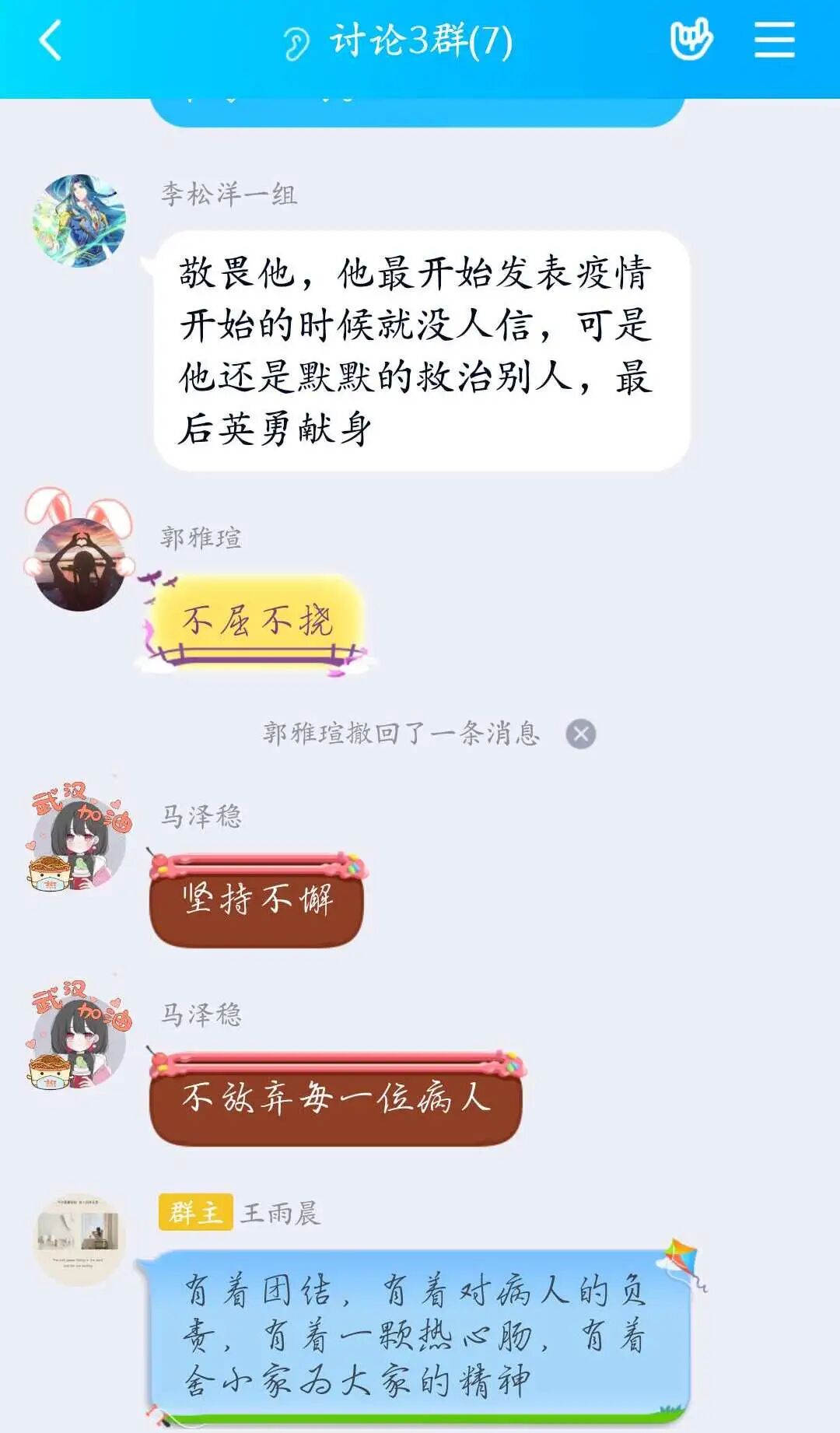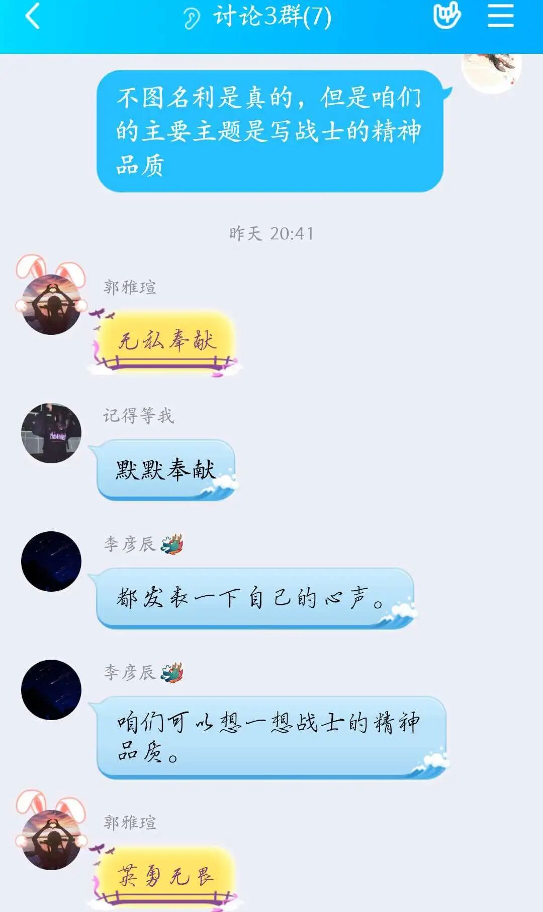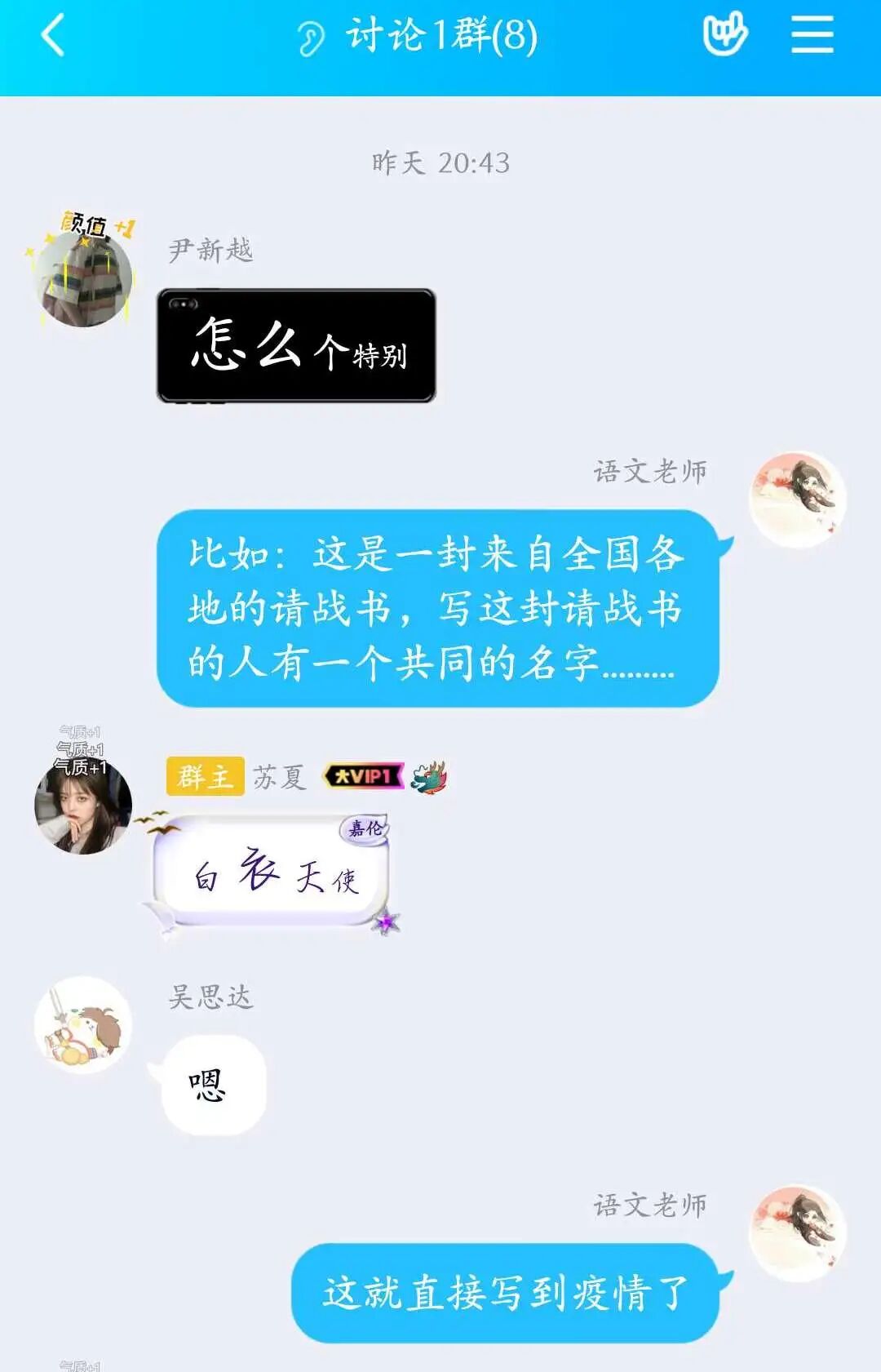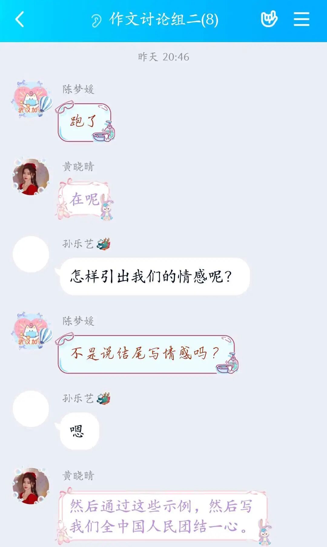 对于写作的学习,我的建议是建一个学生讨论群,建群的当天群里就讨论得热火朝天。自此,每天的最后一节自习过后,另一处学习角,就是学生们兴趣学习的小世界。老师给出一个作文主题,同学们写作文发到讨论群里传看、讨论,有时还可以来个语音讨论,大家畅所欲言。