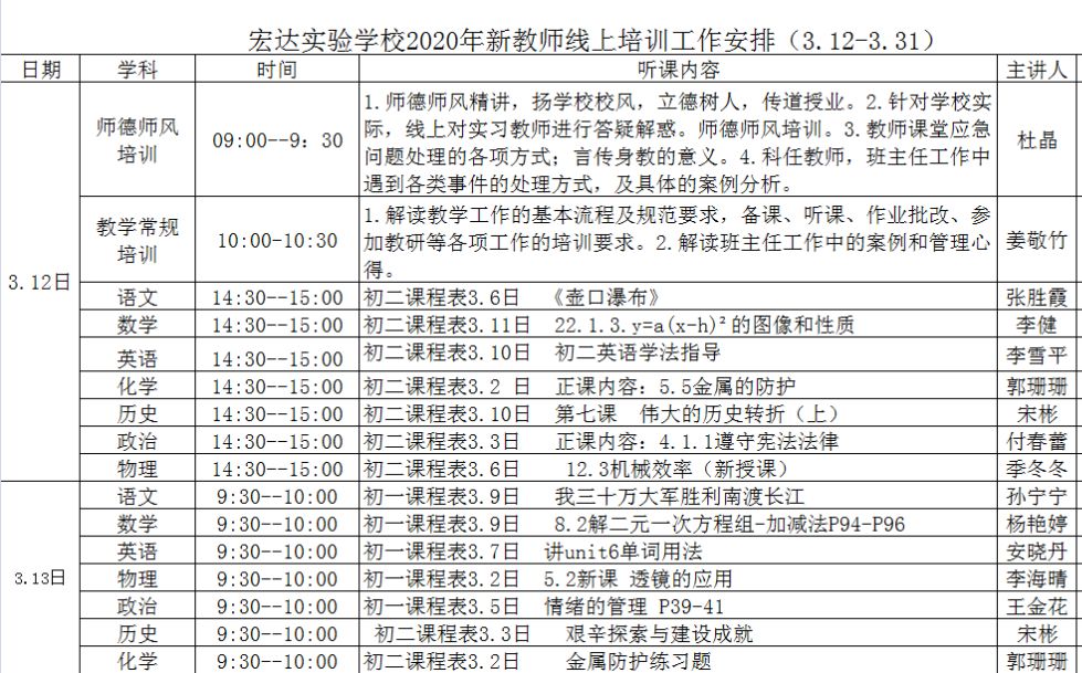3月12日上午9点,杜晶主任为新教师做师德师风培训,通过杜晶主任的言传身教和师德师风精讲,教师们进一步理解了传道授业的意义所在。上午10点,初一姜敬竹主任为新教师做教学常规培训,解读教学工作的基本流程及规范要求, 并解读班主任工作中的案例和管理心得。3月12日下午,新教师们立刻进入线上视频,开始听课学习,并表示要认真向优秀教师和学科组长学习,尽快提高自己的业务能力和教学水平。