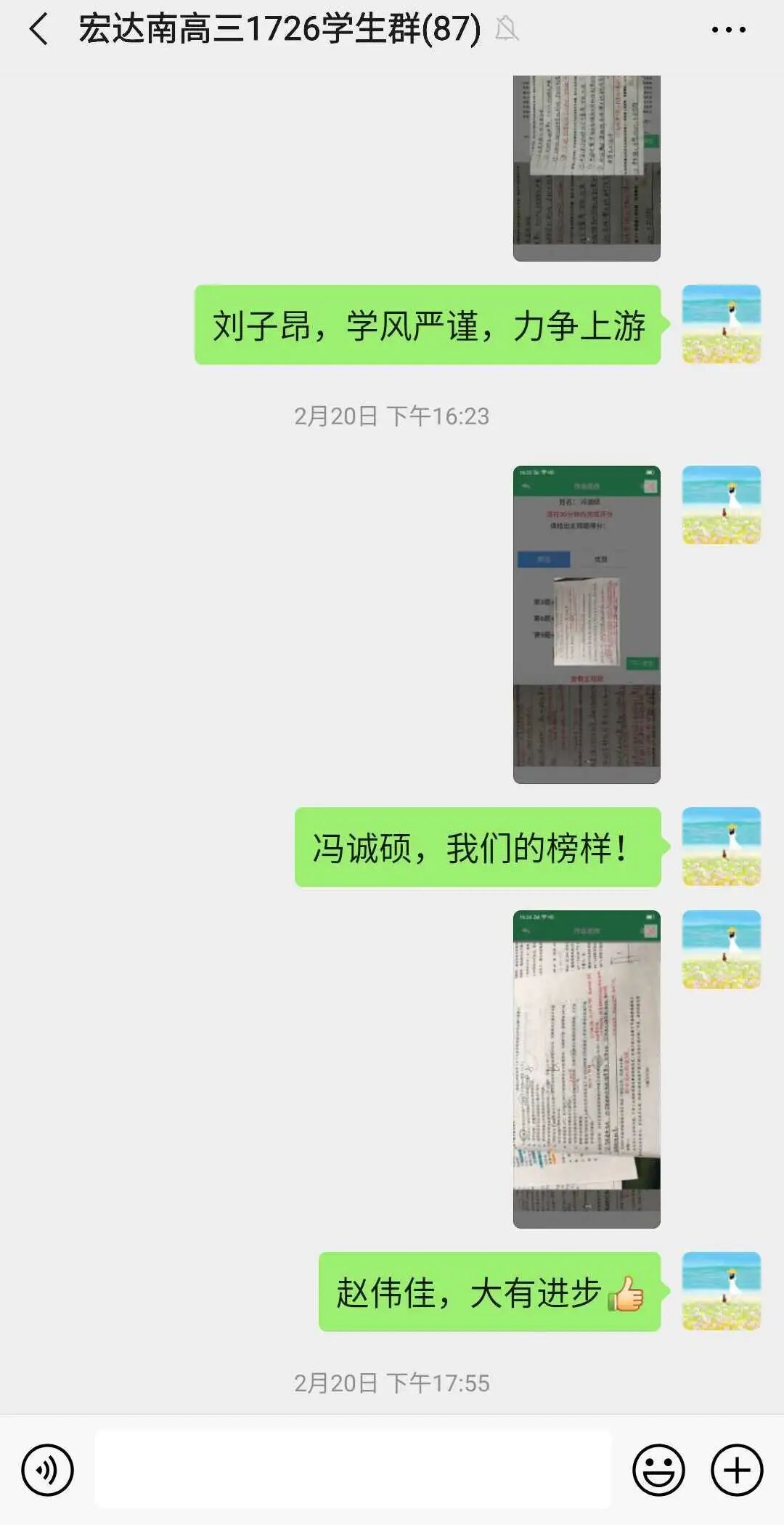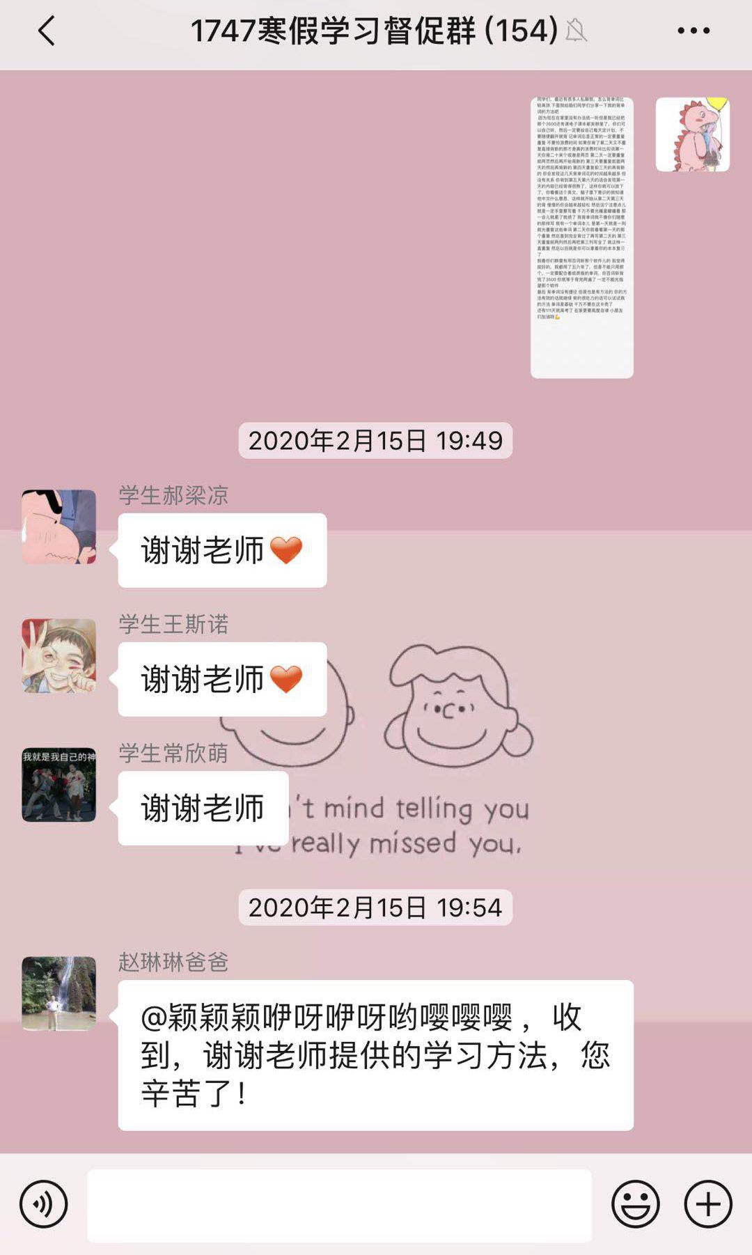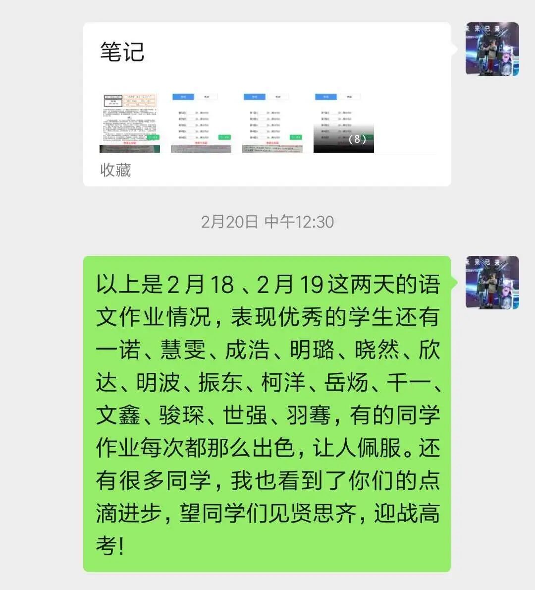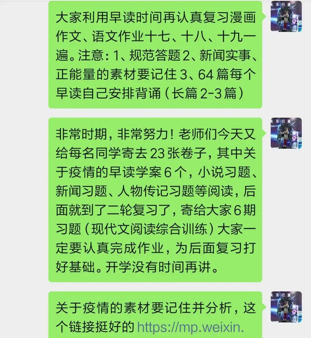 在假期开始的前几天,老师给学生模板作业,让学生们看看优秀作业为什么优秀,优秀在哪里。每天批改完作业,在微信群里点名表扬优秀同学,也批评作业不合格的同学。老师还时常在微信群里给出励志小故事,或者励志言语,或者从反面来解读努力。除了注重学习外,老师还注重学生们的心里状态,及时与有问题的学生沟通、疏导。