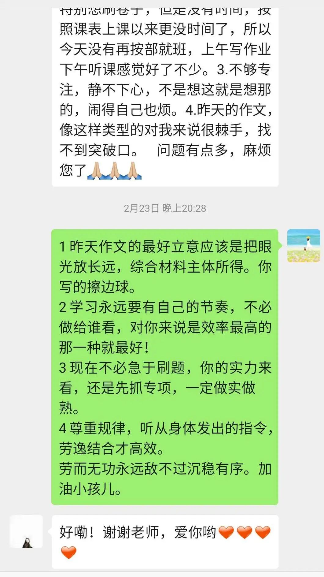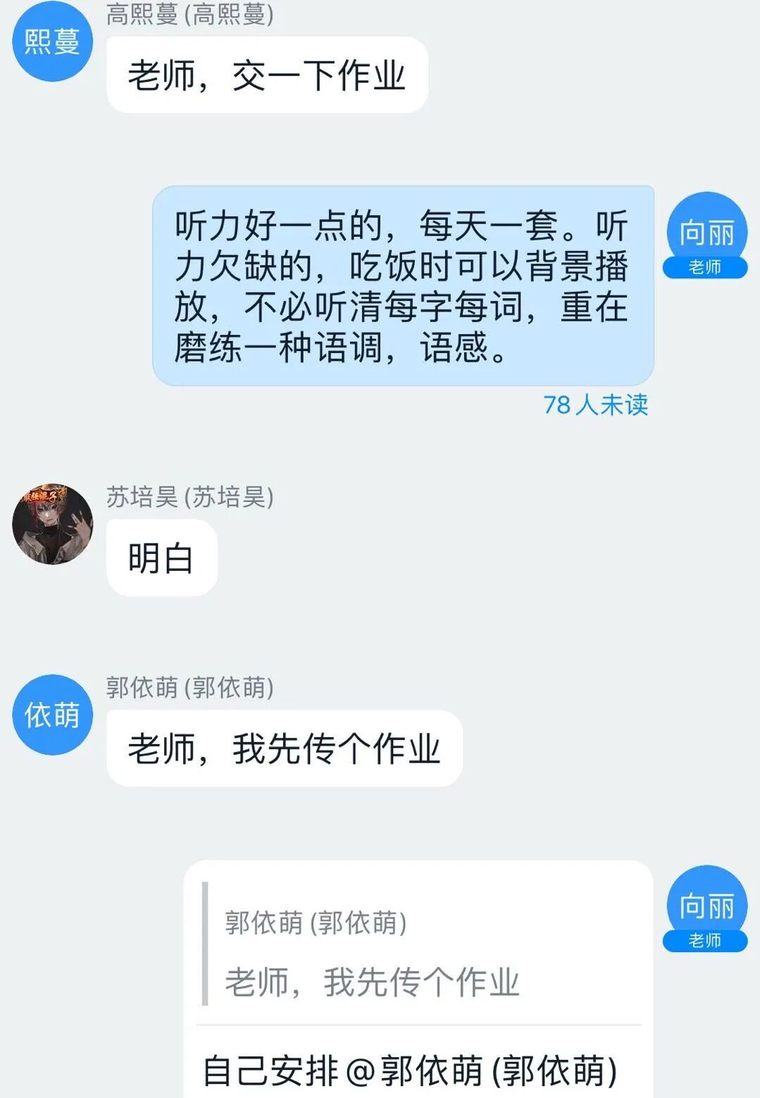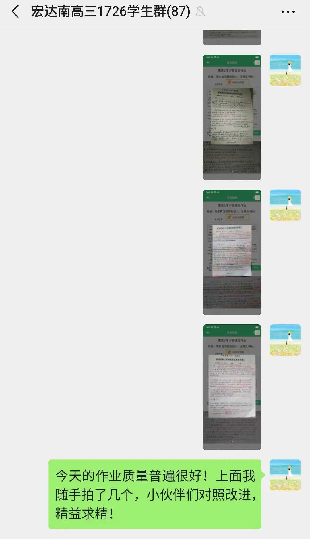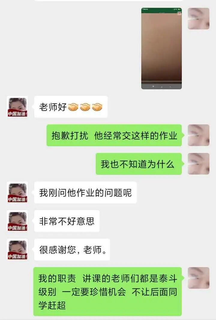 在假期开始的前几天,老师给学生模板作业,让学生们看看优秀作业为什么优秀,优秀在哪里。每天批改完作业,在微信群里点名表扬优秀同学,也批评作业不合格的同学。老师还时常在微信群里给出励志小故事,或者励志言语,或者从反面来解读努力。除了注重学习外,老师还注重学生们的心里状态,及时与有问题的学生沟通、疏导。