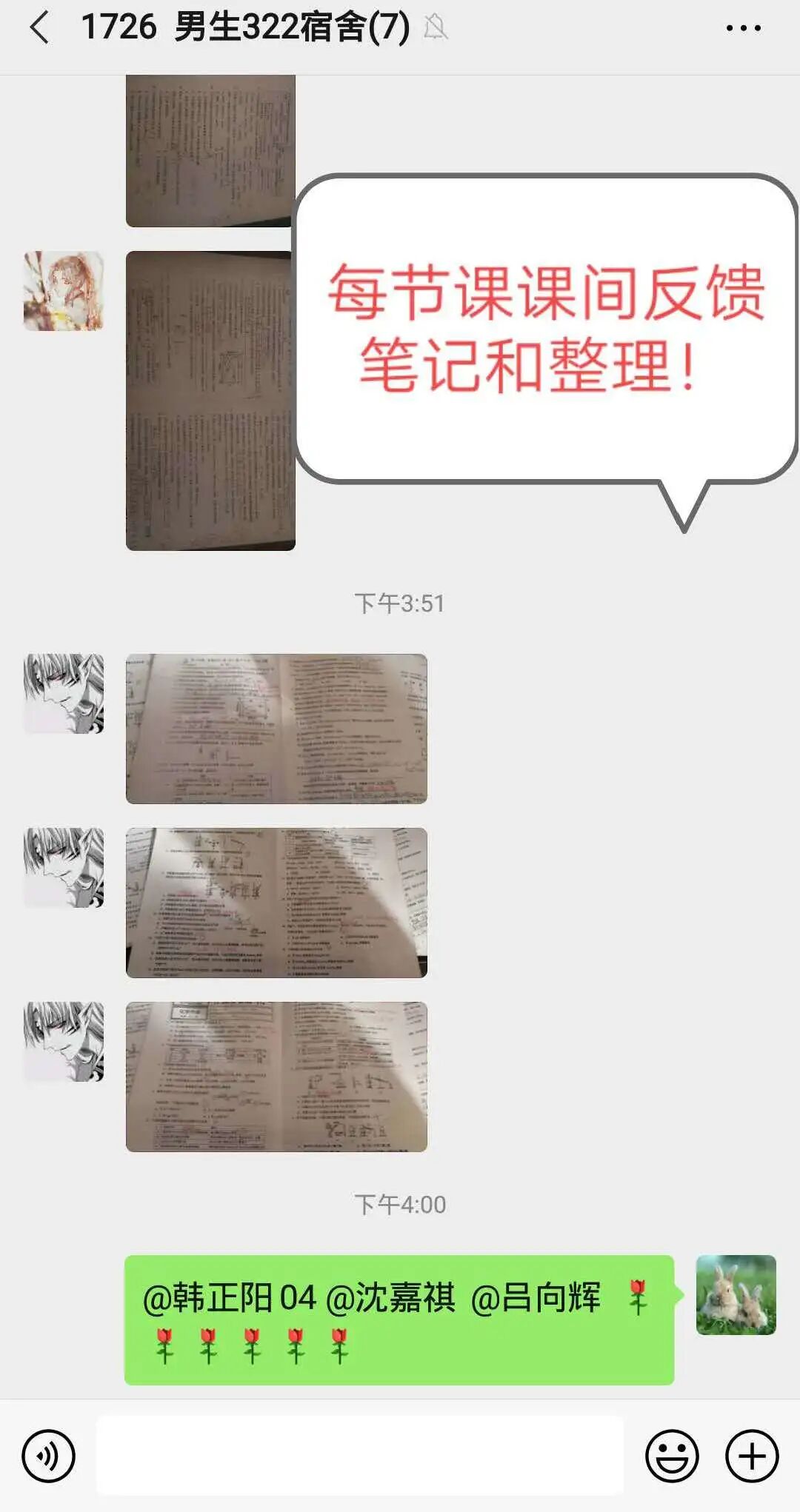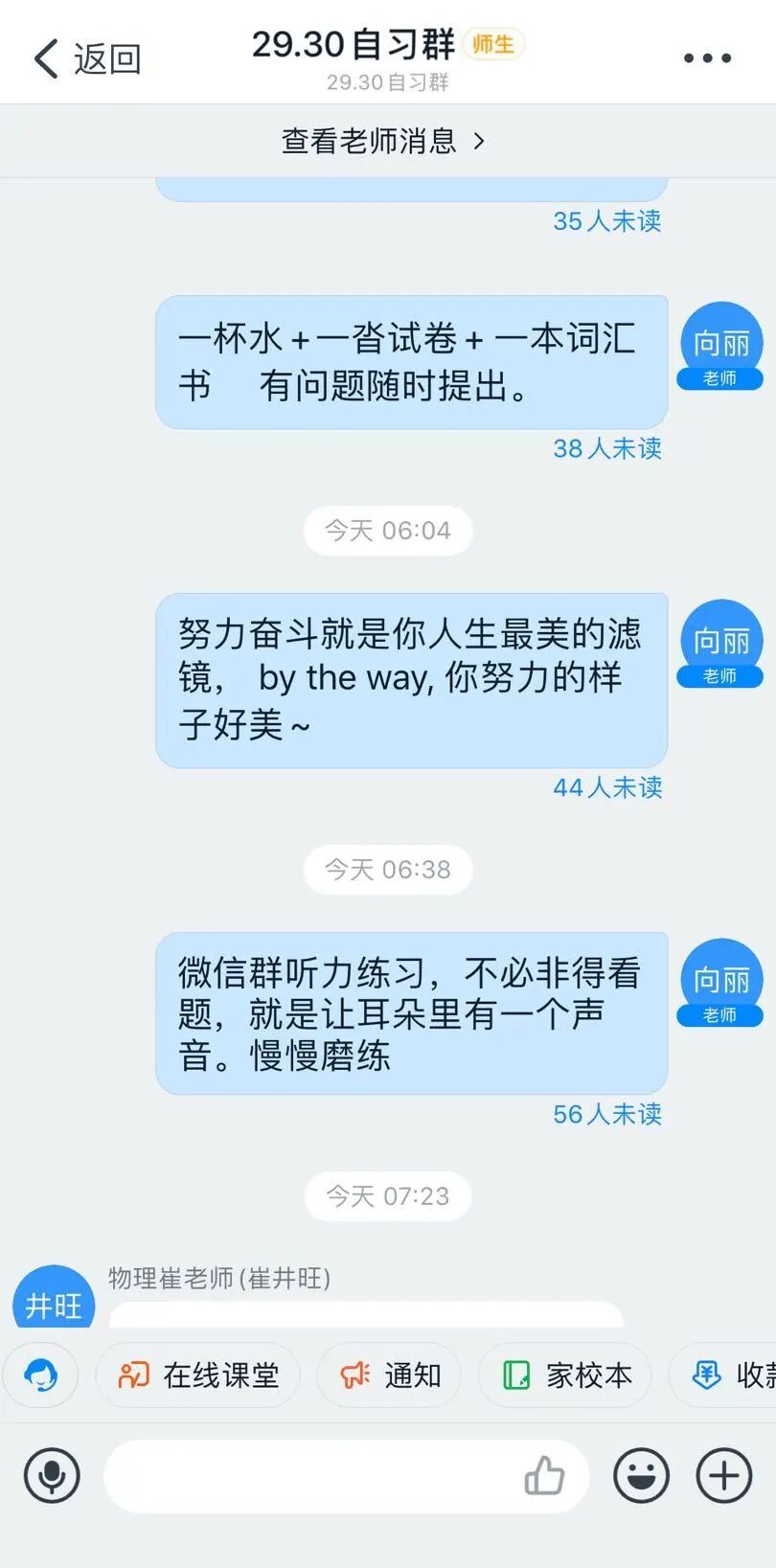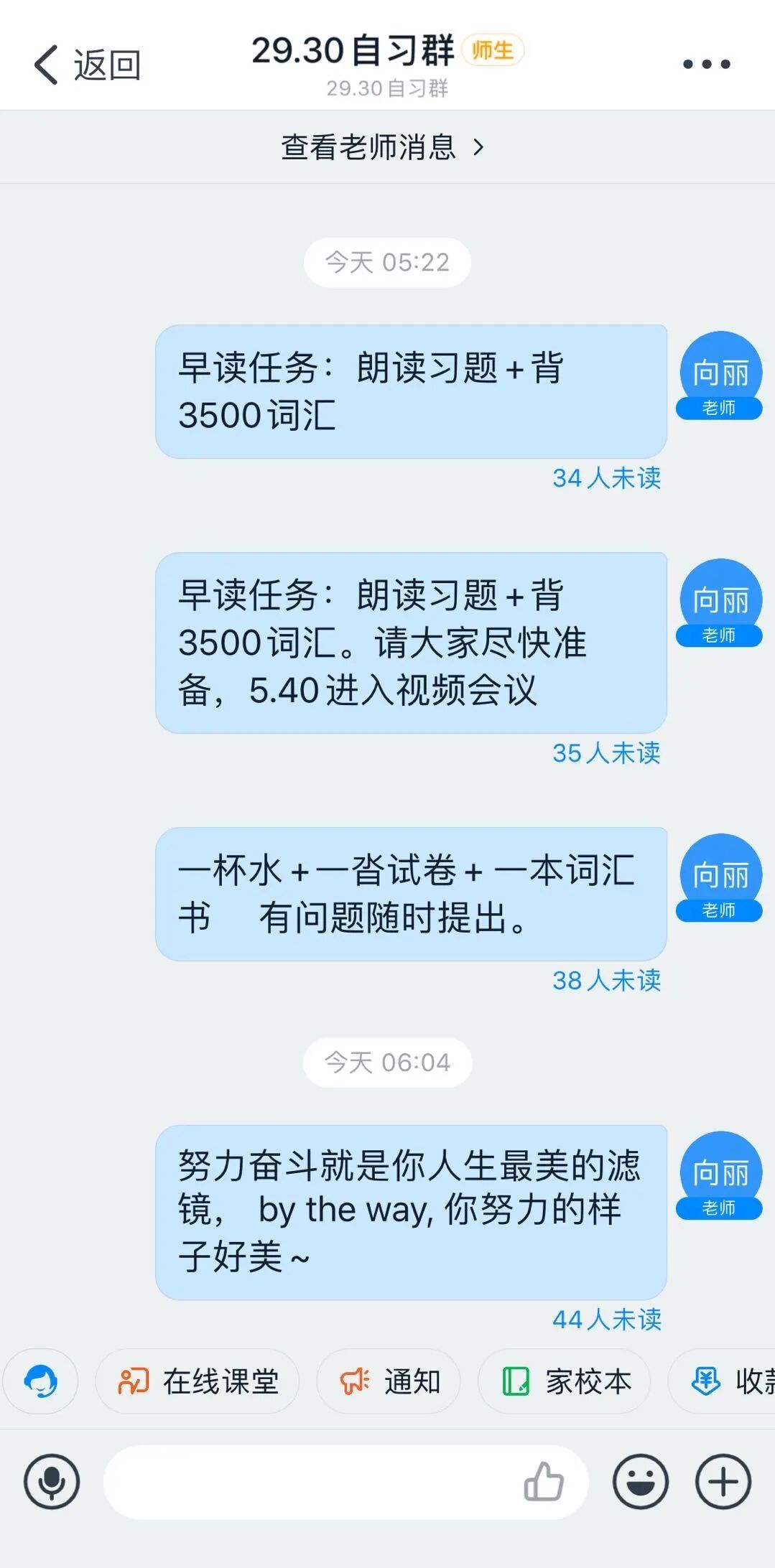 每天五点多群内喊学生起床,并督促进入状态。要求学生认真听视频、并做笔记,随时抽查。针对性找学生视频通话,了解学习状态。在微信群、qq群、钉钉群给学生针对辅导。对于和家长关系僵硬的学生,隔三差五的沟通。