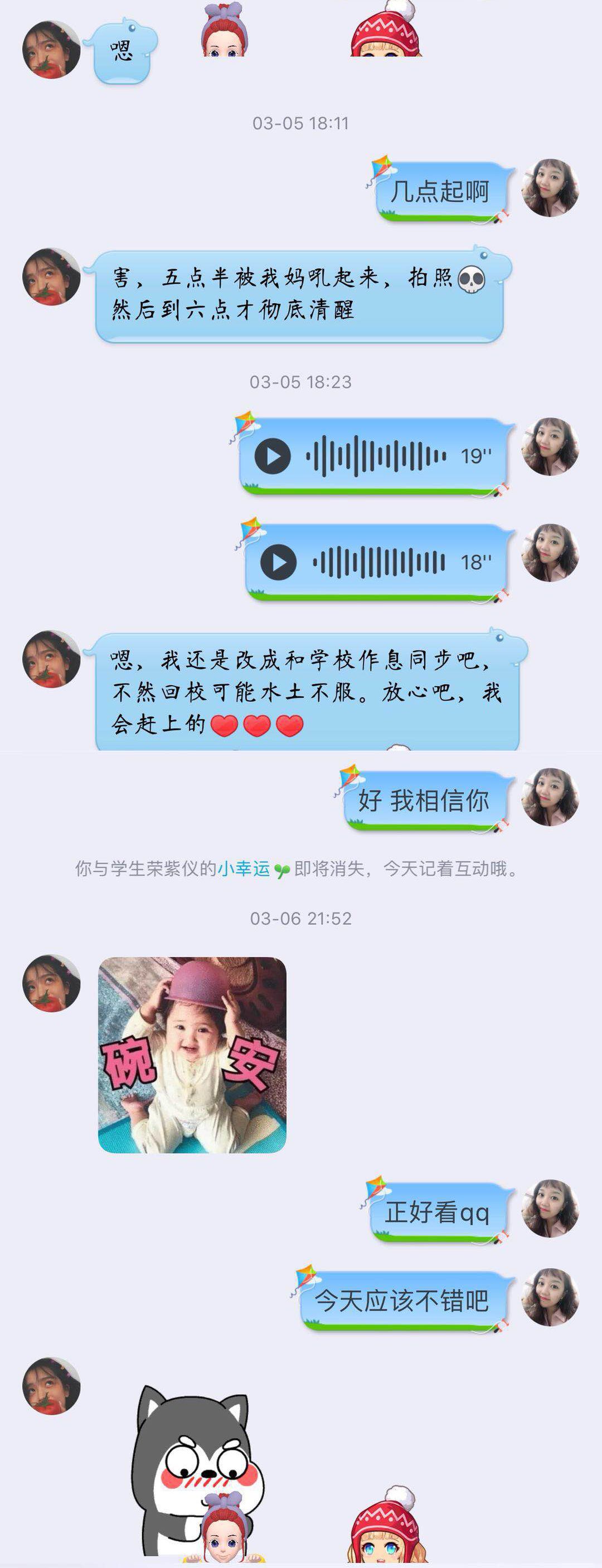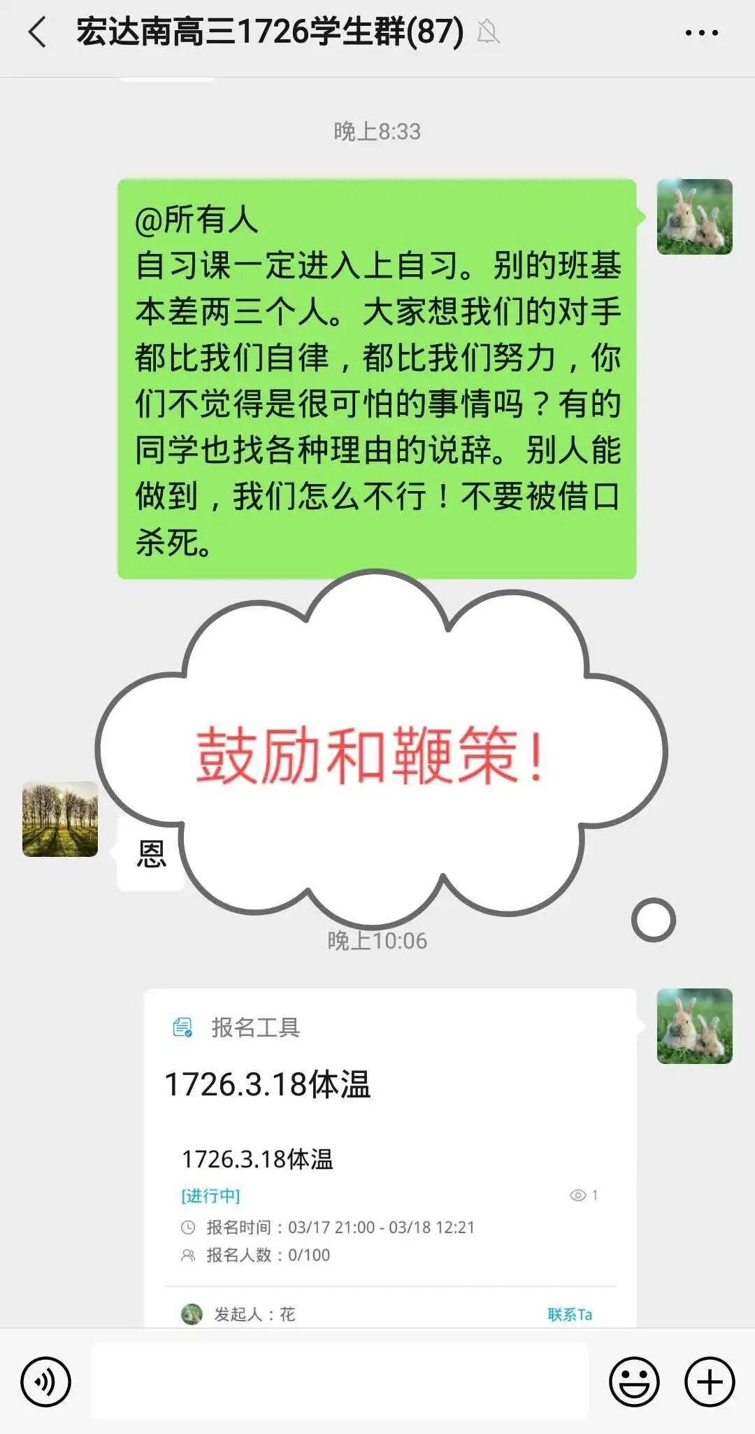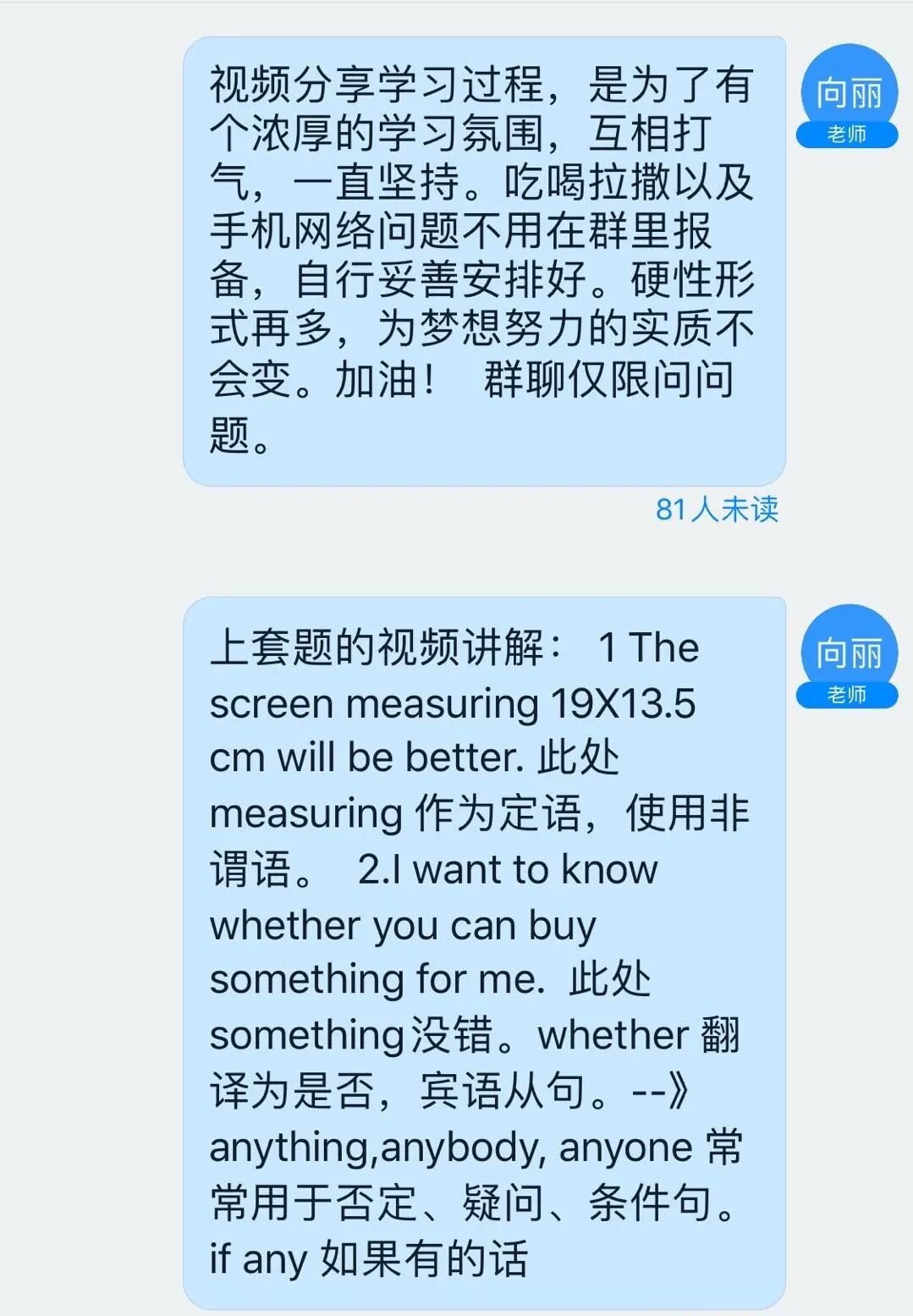 每天五点多群内喊学生起床,并督促进入状态。要求学生认真听视频、并做笔记,随时抽查。针对性找学生视频通话,了解学习状态。在微信群、qq群、钉钉群给学生针对辅导。对于和家长关系僵硬的学生,隔三差五的沟通。
