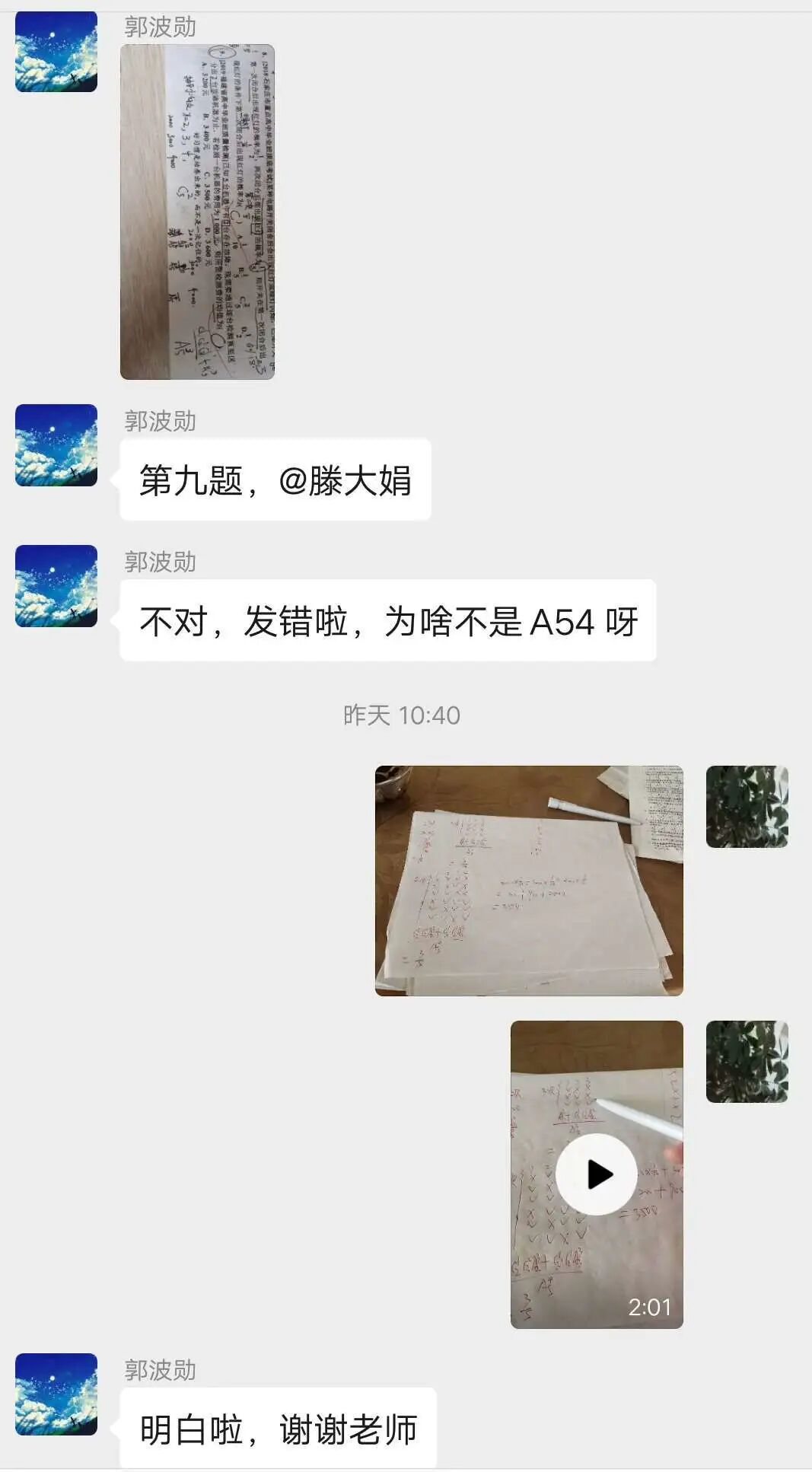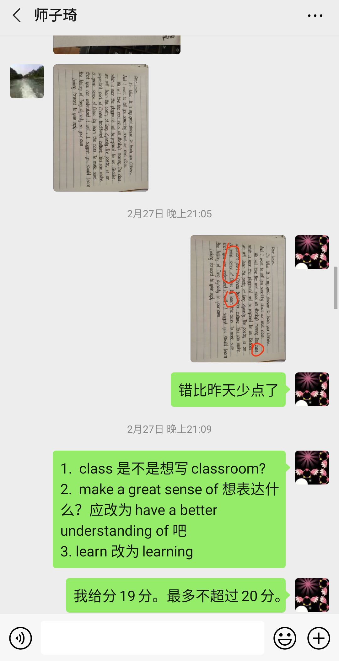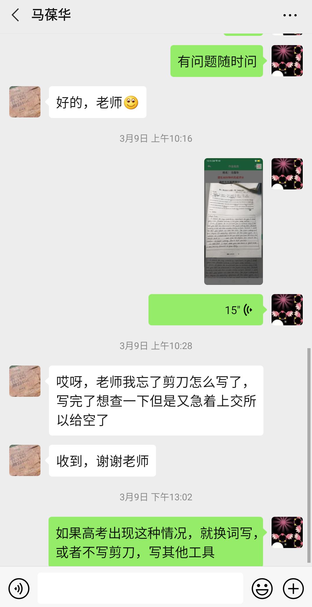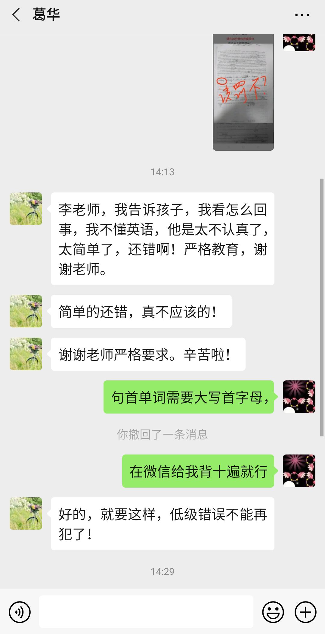 在批阅作业的过程当中,对有问题的作业,边判边截图,在所截图片中标出学生的错误,通过微信发给学生,要求学生把错误改正并语音解释给老师听。对于作业不认真的同学,及时微信联系。批改完作业之后,老师会在学生群中把典型错误以及其延伸,拓展出来让学生记住。在平时,会让学生在传新作业的基础上把上节课所做题所听课笔记一并上传,一一检查后,家长群内通报(表扬加批评)。学生问的比较集中的问题,就在学生群里及时讲解回答。