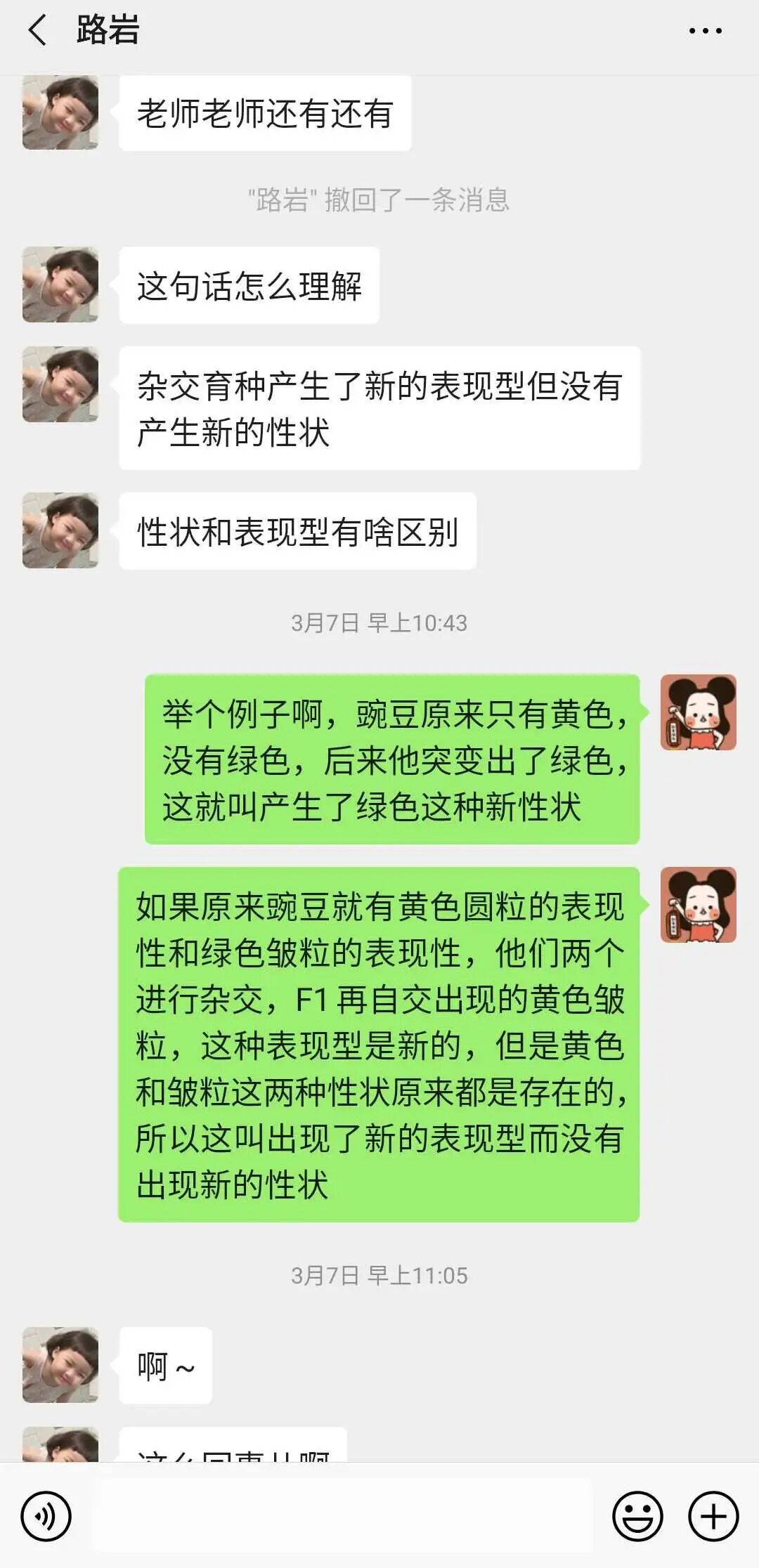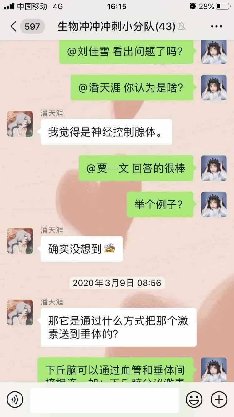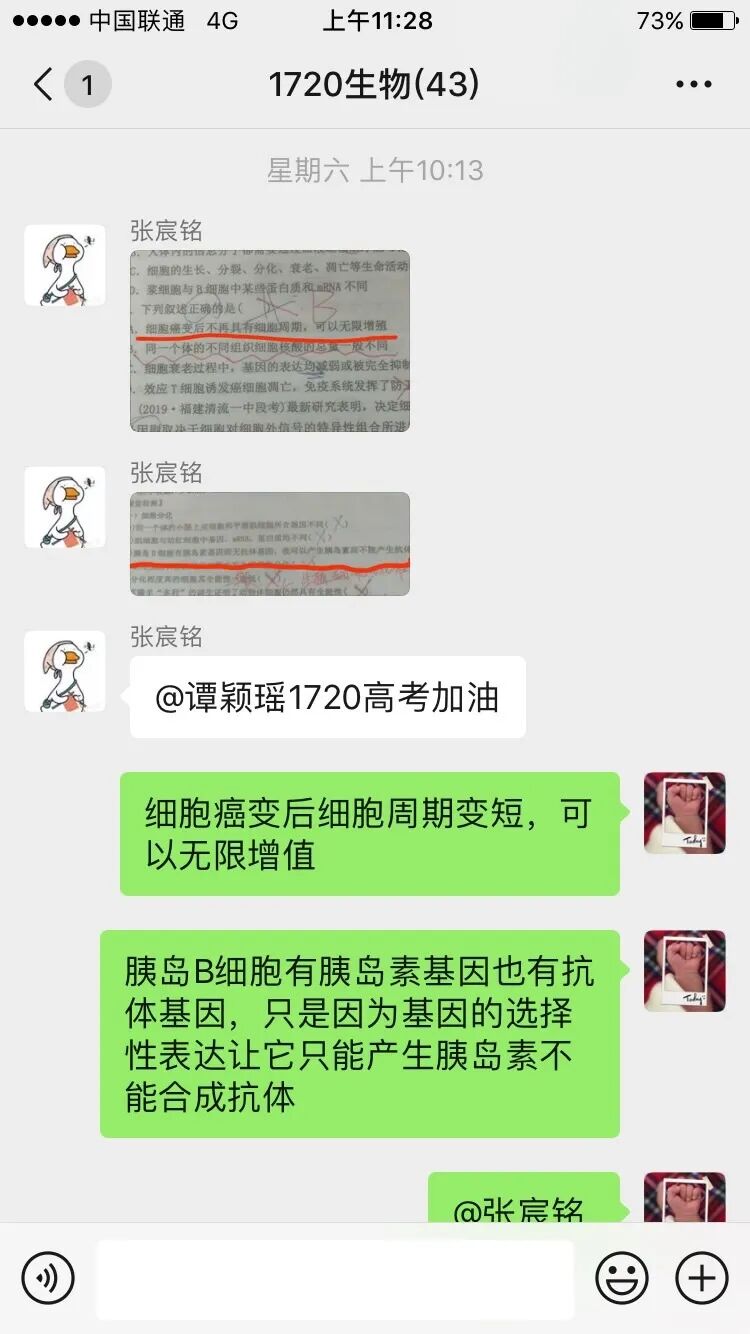 除了正常的督促学生听课、交作业,全批全改作业,还及时地找到学习状态不好的学生进行心理疏导和鼓励,并制定一些可行性高的小目标鼓励学生去完成;对于作业完成情况较好的同学进行适当的表扬,帮助同学们树立信心。批改作业时,个别学生的问题利用评价留言提醒。建立生物学习群,及时解答同学们的问题。