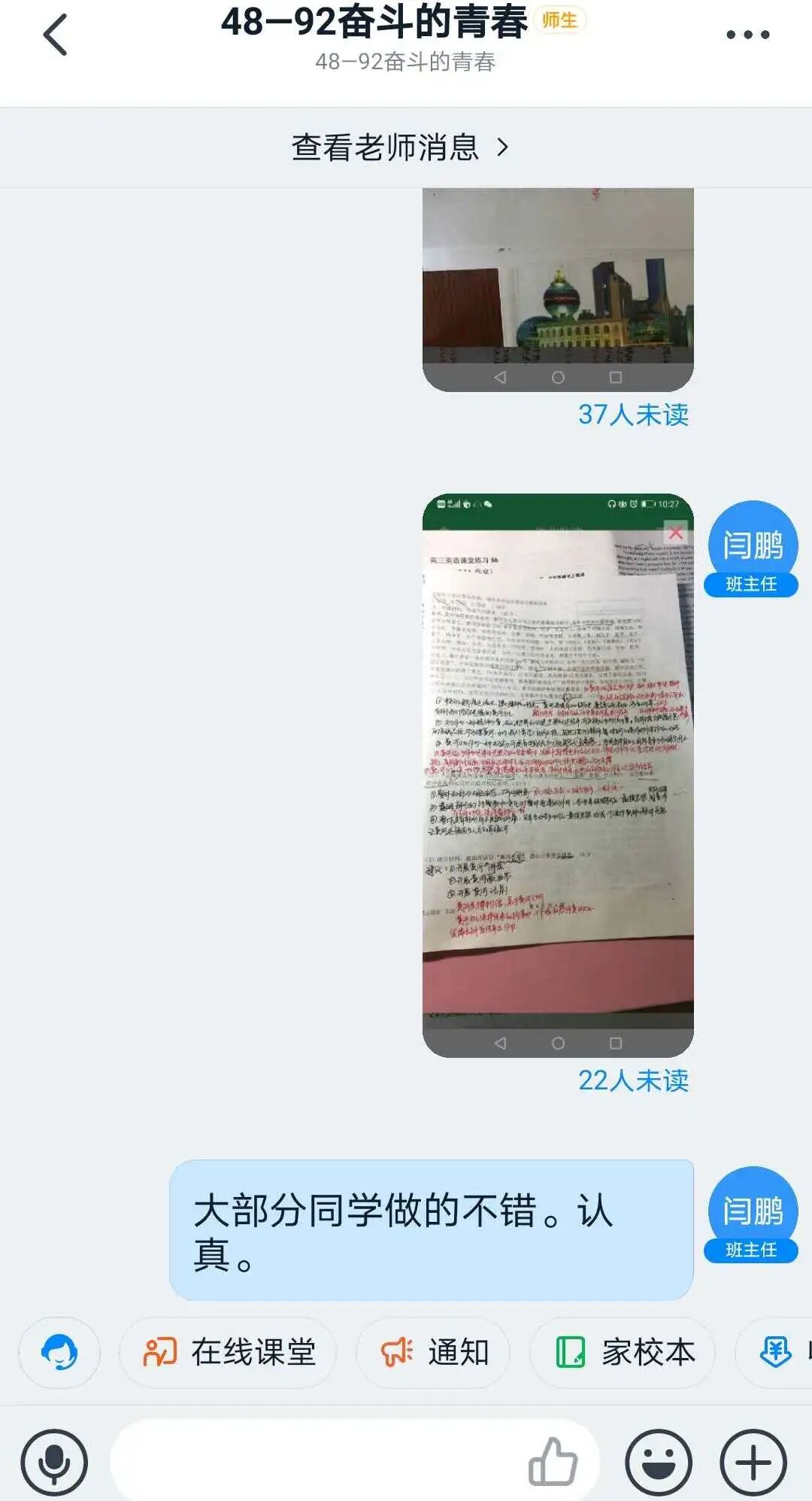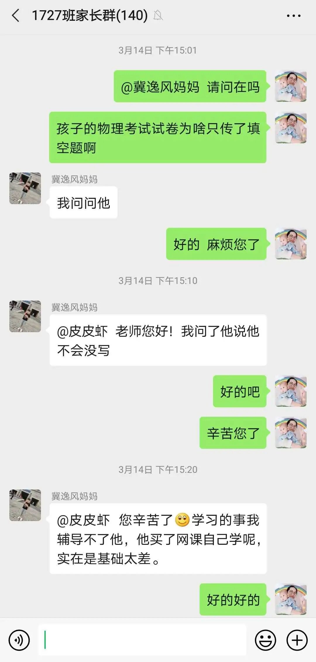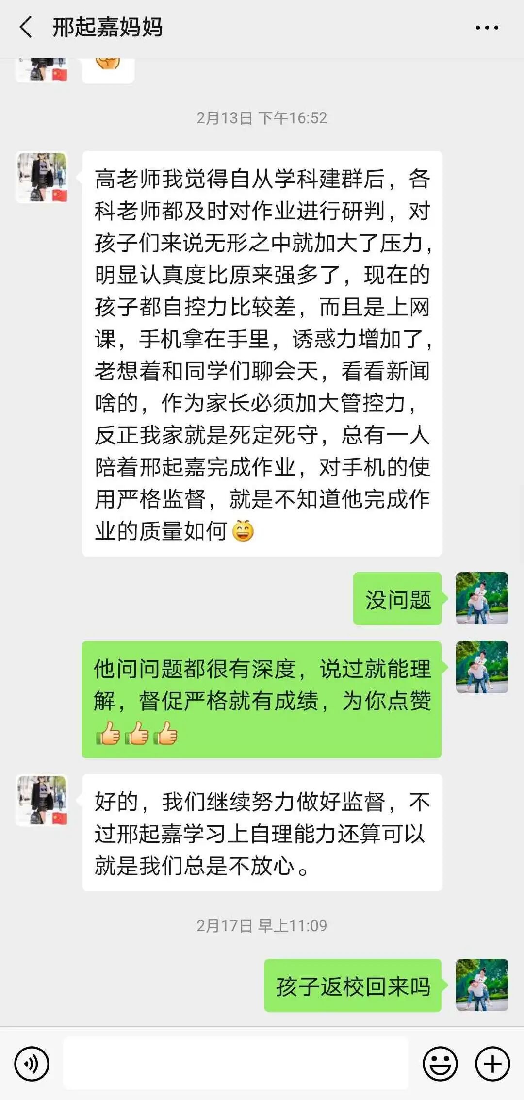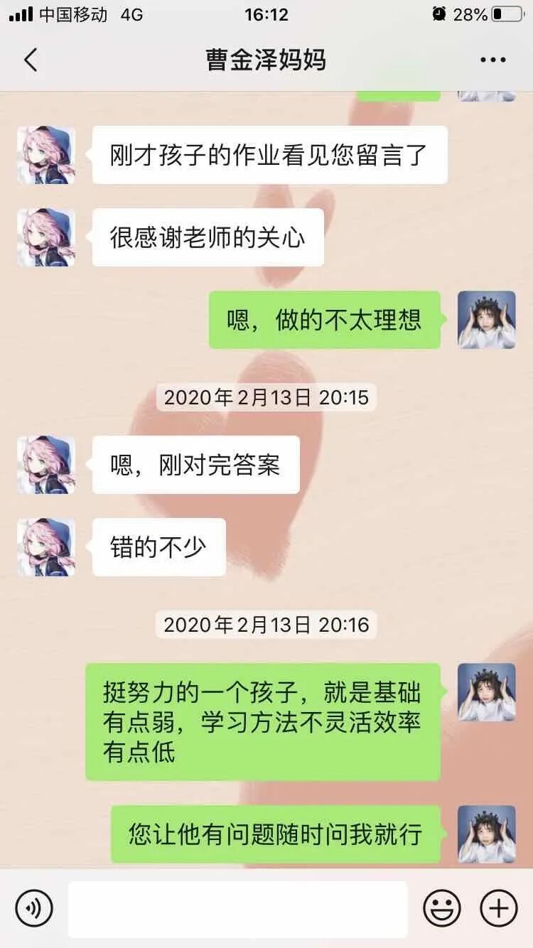 对每天布置的课堂作业、学案在家长群进行通报,有表扬,有批评。对学生的问题,除了课间解答外,每晚整理自习时,准时给学生在群内讲解。对一些家长管理不了的孩子,私底下和班主任老师沟通,更全面了解孩子,商量对策,然后给孩子电话疏导,取得了很好的效果。