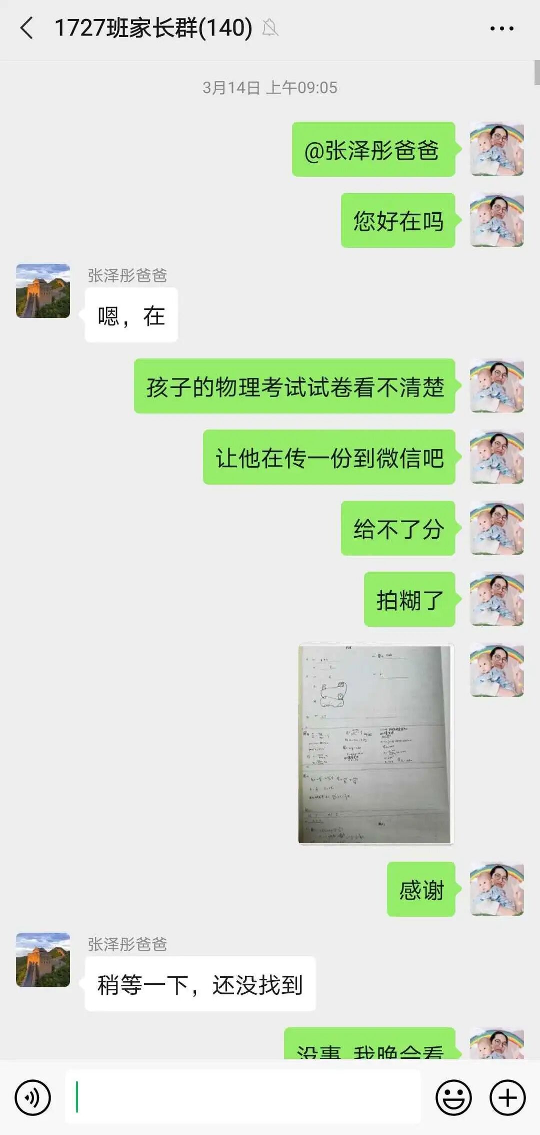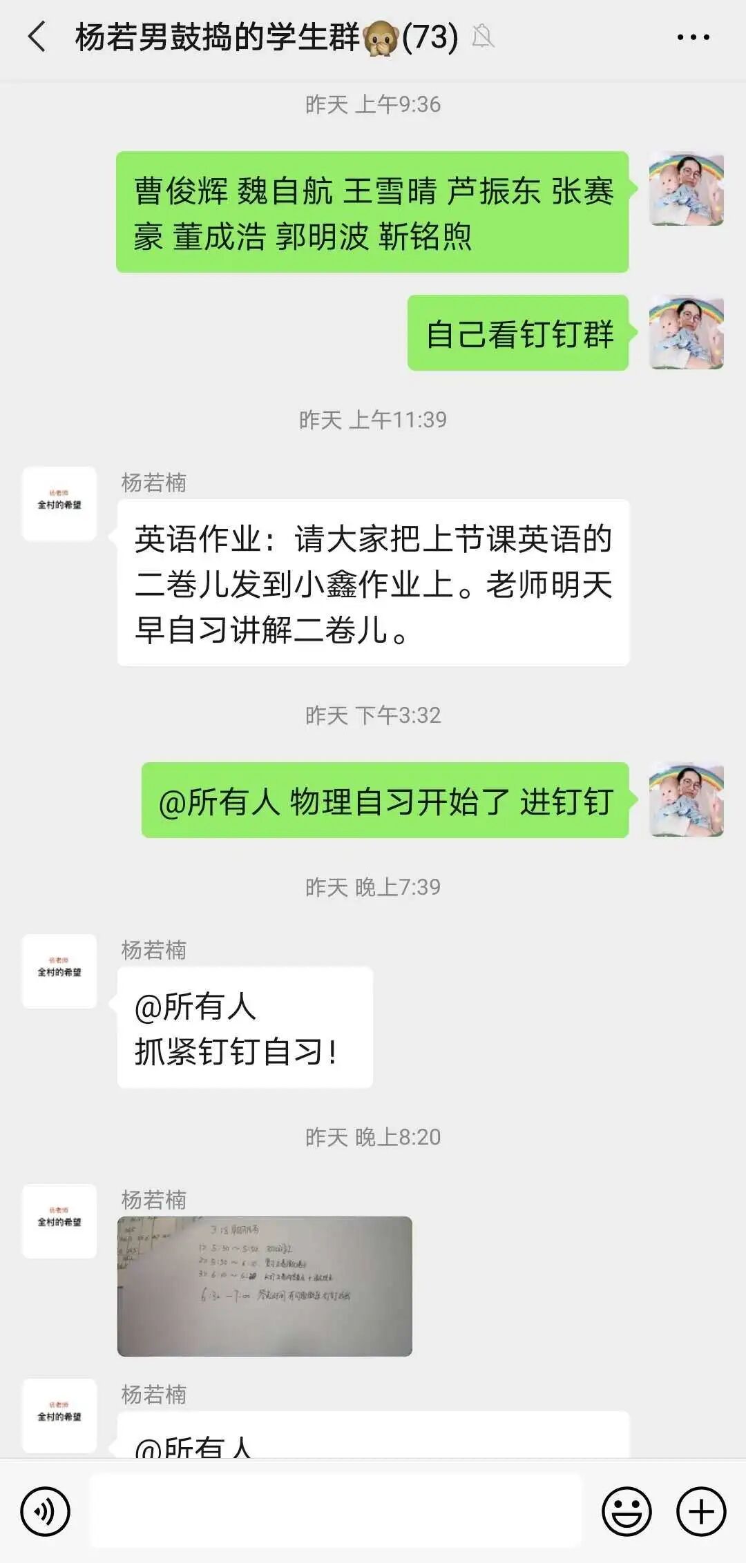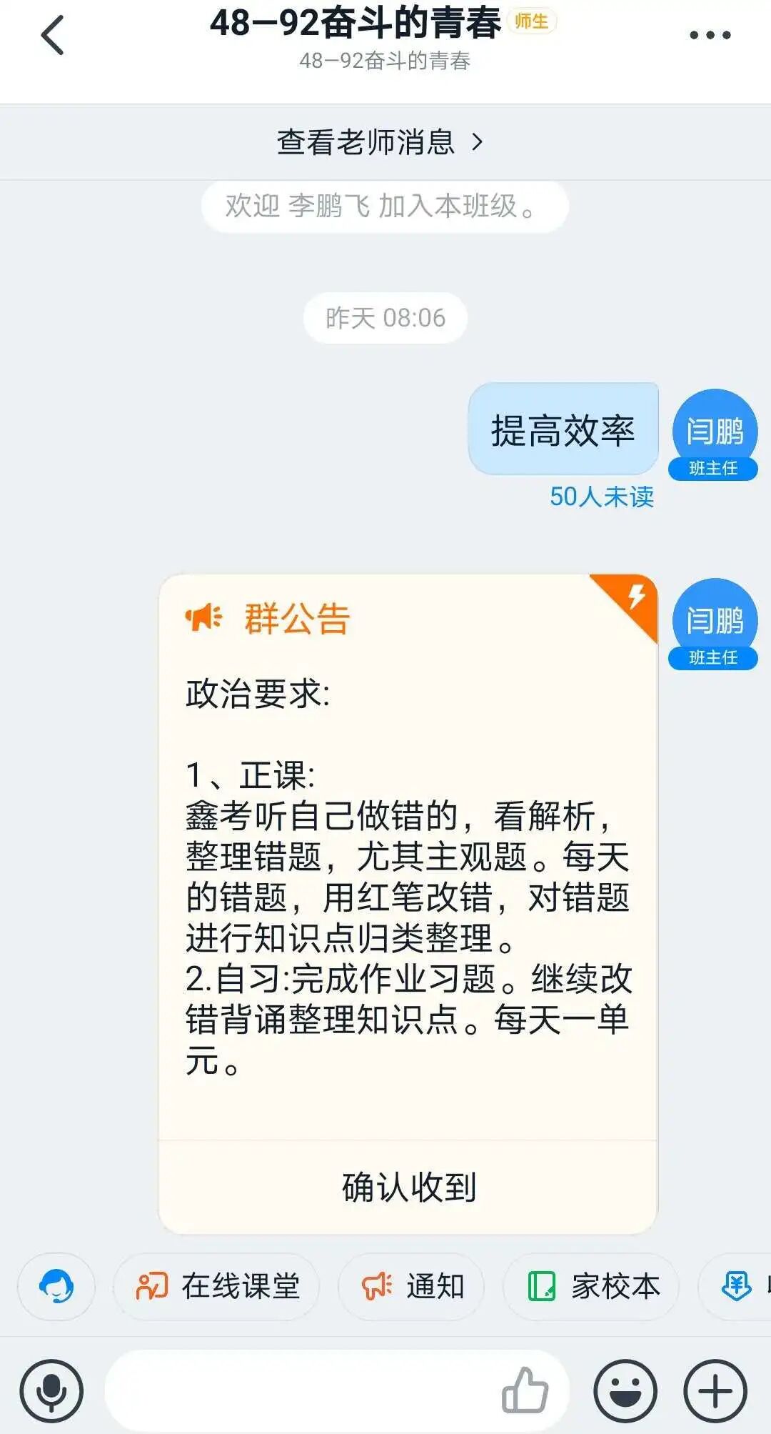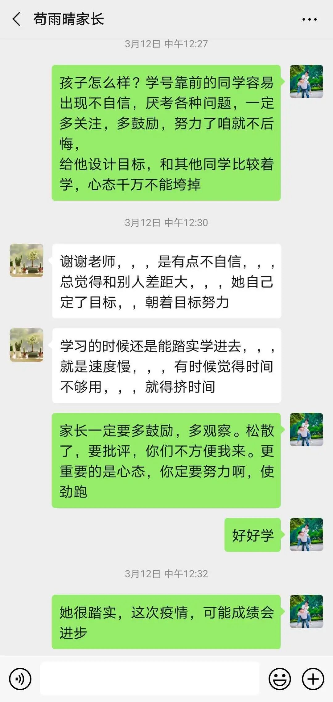 对每天布置的课堂作业、学案在家长群进行通报,有表扬,有批评。对学生的问题,除了课间解答外,每晚整理自习时,准时给学生在群内讲解。对一些家长管理不了的孩子,私底下和班主任老师沟通,更全面了解孩子,商量对策,然后给孩子电话疏导,取得了很好的效果。