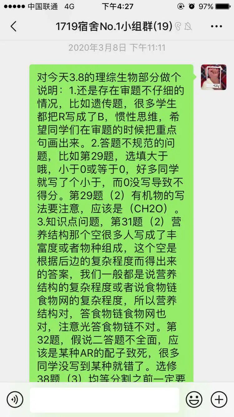 疫情一开始就建立生物辅导群,督促学生按时上课、提交作业。每次阅卷之后,都会写一个关于本次试卷的评价发到群里,这个评价主要是本次试卷中普遍出现的错误,汇总分类告诉学生(例如:1.审题错误如第几题第几空;2.知识性错误如第几题第几空;3.错别字问题等等)。督促学生上交改错本,改错有出现的问题的学生,利用整理自习单独辅导。