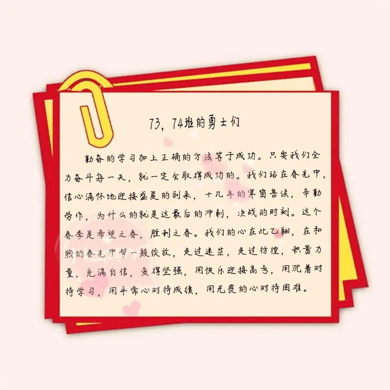 勤奋的学习加上正确的方法等于成功。只要我们全力奋斗每一天,就一定会取得成功的。我们站在春光中,信心满怀地迎接盛夏的到来,十几年的寒窗苦读,辛勤劳作,为什么的就是这最后的冲刺,决战的时刻。这个春季是希望之春,胜利之春。我们的心在此乙翔,在和煦的春光中梦一般绽放,走过迷茫,走过彷徨,积蓄力量,充满自信,变得坚强,用快乐迎接高考,用沉着对待学习,用平常心对待成绩,用无畏的心对待困难。