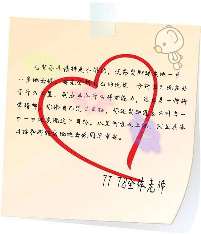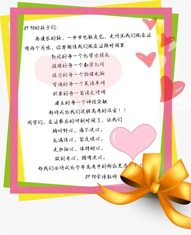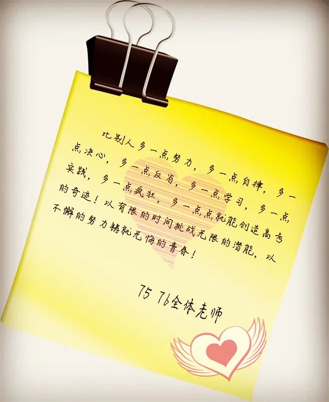 比别人多一点努力,多一点自律,多一点决心,多一点反省,多一点学习,多一点实践,多一点疯狂,多一点点就能创造高考的奇迹!以有限的时间挑战无限的潜能,以不懈的努力铸就无悔的青春!
