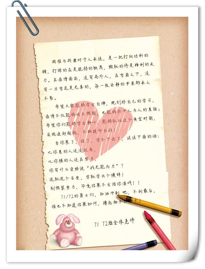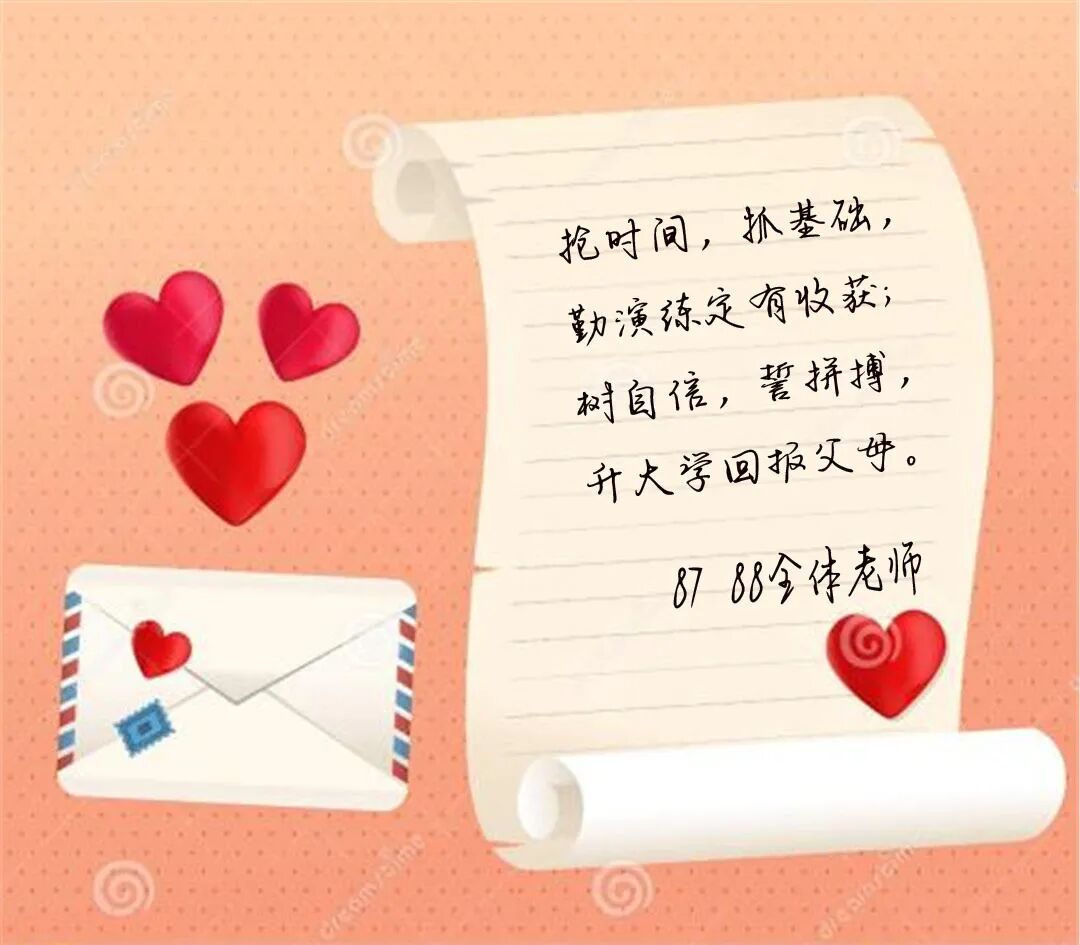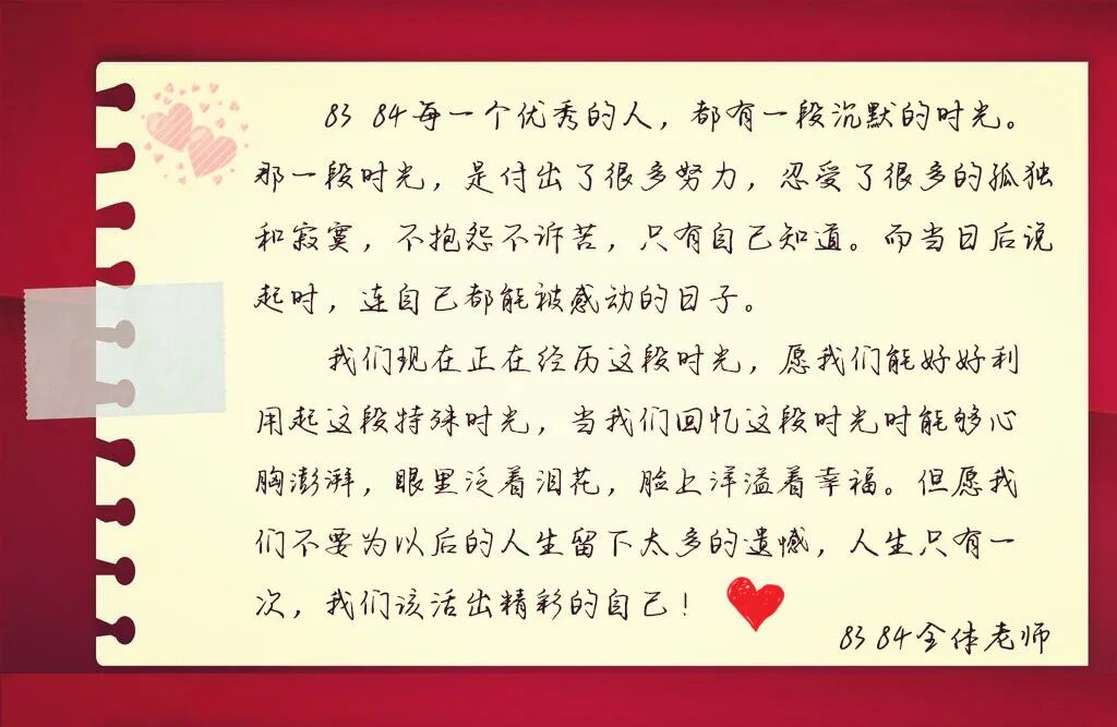 冠疫无情,师生有情!今天3月27日,星期五,距离高考还有71天,虽然我们没有机会聚在熟悉的教室,也许久没有面对面的倾诉衷肠,但是,老师们无时无刻不牵挂着你们。老师们写下了对孩子们的寄托,只为在这特殊的时期,你们能更好的成长!接下来,我们一起来看看老师们对你们的心声!