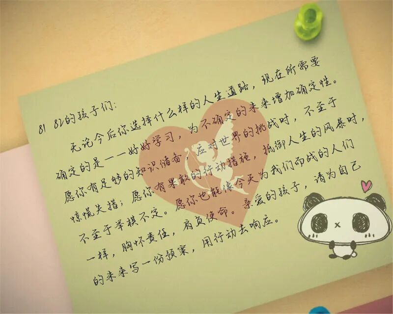 无论今后你选择什么样的人生道路,现在所需要确定的是——好好学习,为不确定的未来增加确定性。愿你有足够的知识储备,应对世界的挑战时,不至于惊慌失措;愿你有果敢的行动措施,抵御人生的风暴时,不至于举棋不定。愿你也能像今天为我们而战的人们一样,胸怀责任,肩负使命。亲爱的孩子,请为自己的未来写一份预案,用行动去响应。