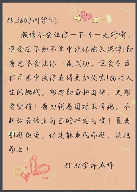 希望大家能够学会自律,规划好自己的学习,疫情不仅能够延长假期,也能够拉开人与人的差距;希望你们能够学会静心,能够抓住这个黄金时期,实现追赶超越,不断提升自我!