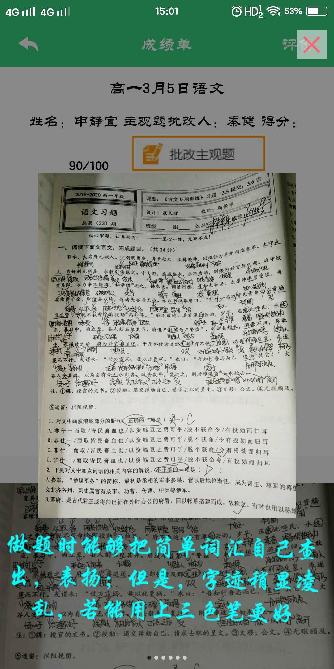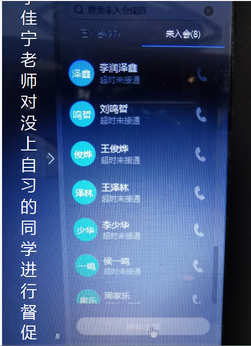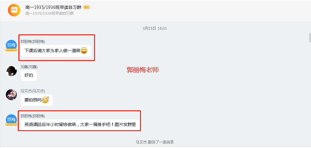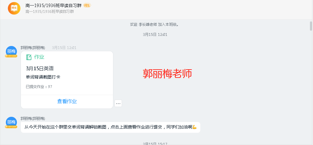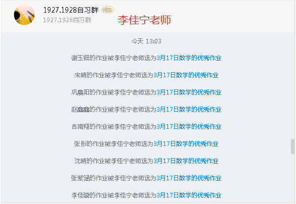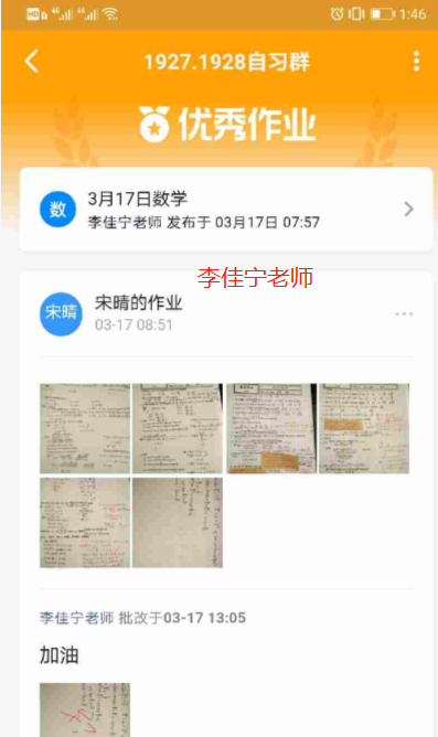 李老师的时间与课程表时间一致,和学生一起听网课,记笔记,下课后马上让学生上传笔记,给出评语,督促学生改正,自习期间学生微信群内问题,予以解答。使用钉钉软件,以视频会议方式自习,自习期间问题答疑,作业批改予以评价,积极表扬优秀同学。