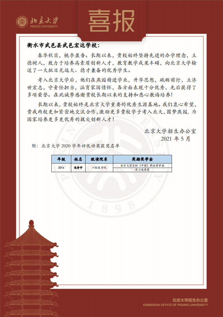 近日,我校2016级毕业生马丹宁同学获得北京大学卫材(中国)药业奖学金、学习优秀奖,北京大学向我校发来喜报表示祝贺,希望两校更加紧密地交流合作,激励更多贵校学子考入北大,圆梦燕园,为国家培养更多更优秀的拔尖创新人才!