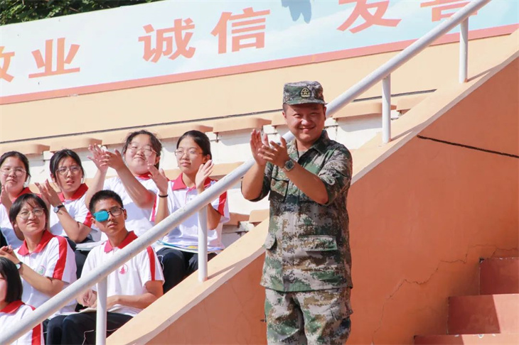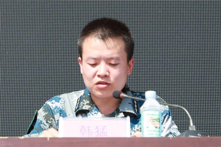 县武装部军训科科长韩猛讲话,韩科长希望同学们以此次军训为起点,保持军训的胜利成果,严于律己,继续发扬不怕苦、不怕累的精神,刻苦学习、奋发进取,把自己培养成为一名品德高尚、知识广博、作风过硬、成绩优异的高素质人才!