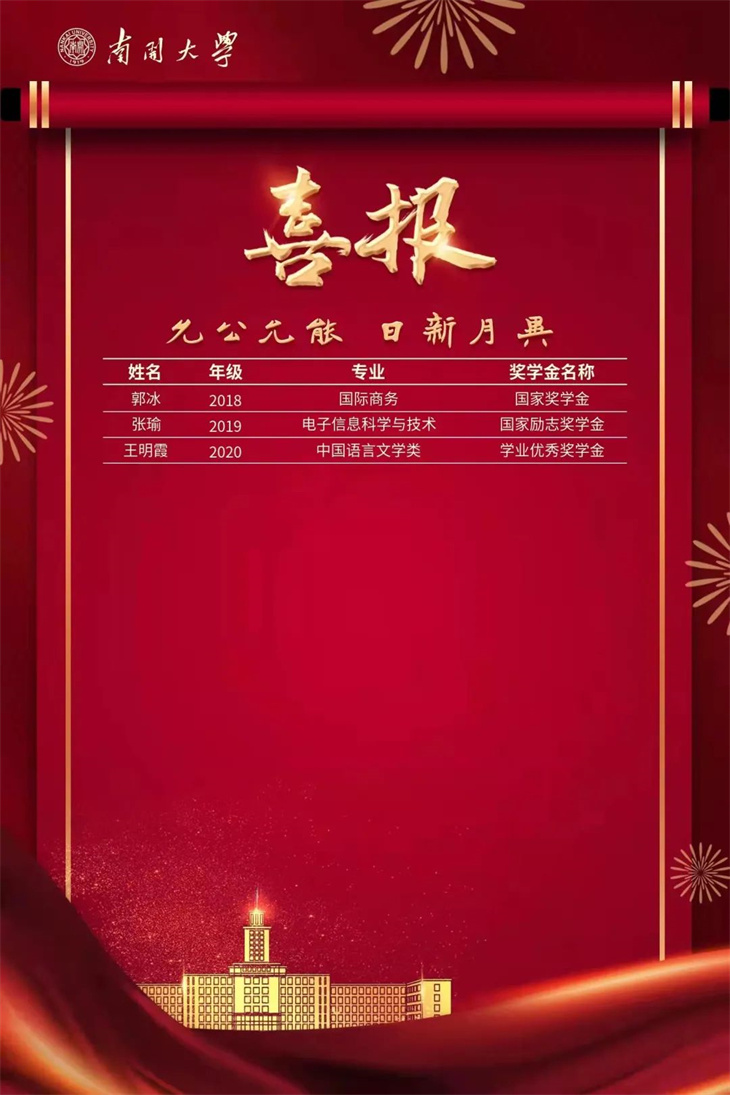 我校菁菁桃李踏入南开、绽放无限芳华,他们仰望星空、脚踏实地,砥志研思、奋楫争先,用青春书写人生的华美篇章。在过去的一年里,我校优秀毕业生郭冰、张瑜、王明霞分别荣获南开大学国家奖学金、国家励志奖学金、学业优秀奖学金,南开大学特向我校发来喜报表示祝贺与感谢,并期待我校更多优秀学子能报考南开,在南开大学获得进步和成长!
