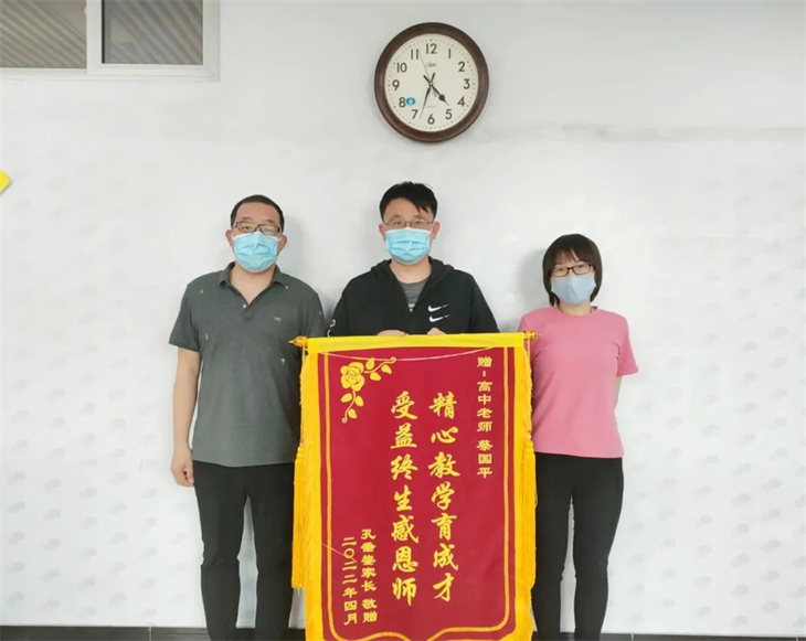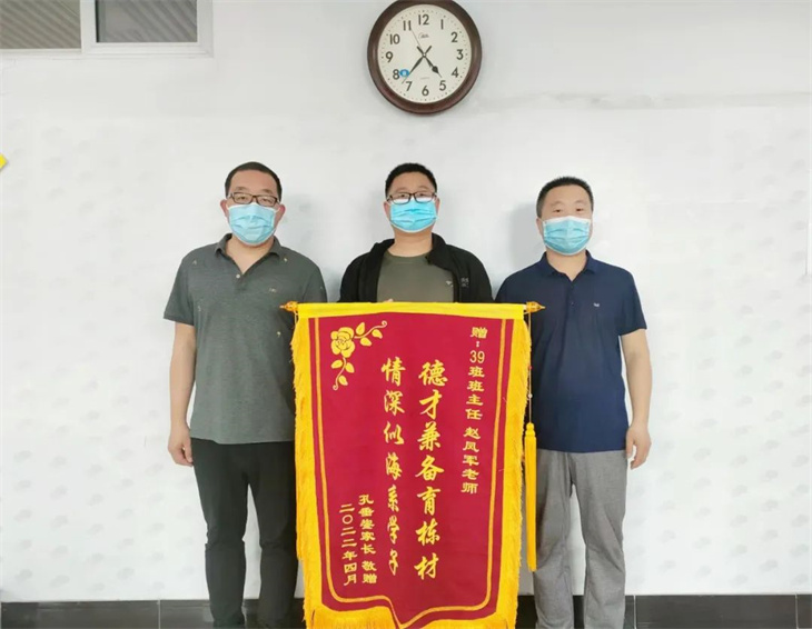 近日,我校高二年级孔垂鋆学生家长通过邮寄的方式向我校及班主任赵凤军老师、蔡国平老师和张晓阳老师赠送了锦旗。四面锦旗上写着“师德高尚展校风 技艺精湛育良才”、“德才兼备育栋材 深情似海系学子”、“精神教学育成才 受益终身感恩师”、“用心做教育 用爱为人师”的字样。这是家长深深的感激之情,代表了家长们对老师们辛勤工作的肯定和认可!