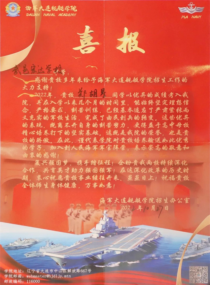 大连海军舰艇学院特别指出:自入学来,郑胡星同学始终坚定理想信念,严格要求,刻苦训练,逐渐适应了严肃紧张而又充实的军校生活,完成了由民到兵的转变,这些优异的表现更得益于高中母校的精心培养,希望两校能持续深化合作,共育英才助力强国强军!衷心祝愿我校事业继往开来、蒸蒸日上!