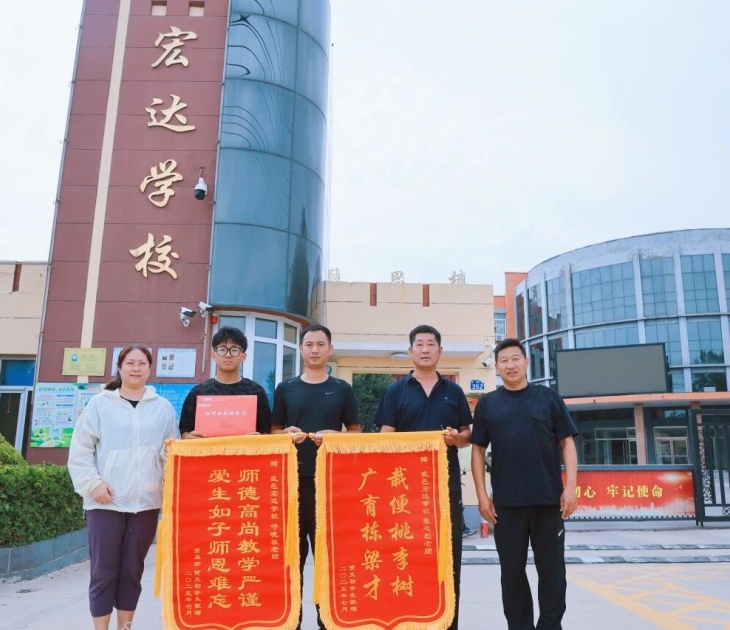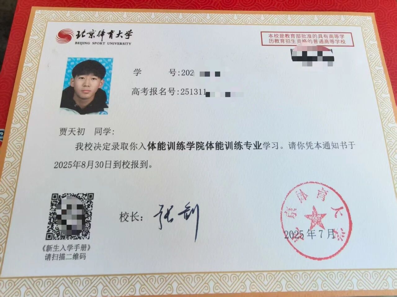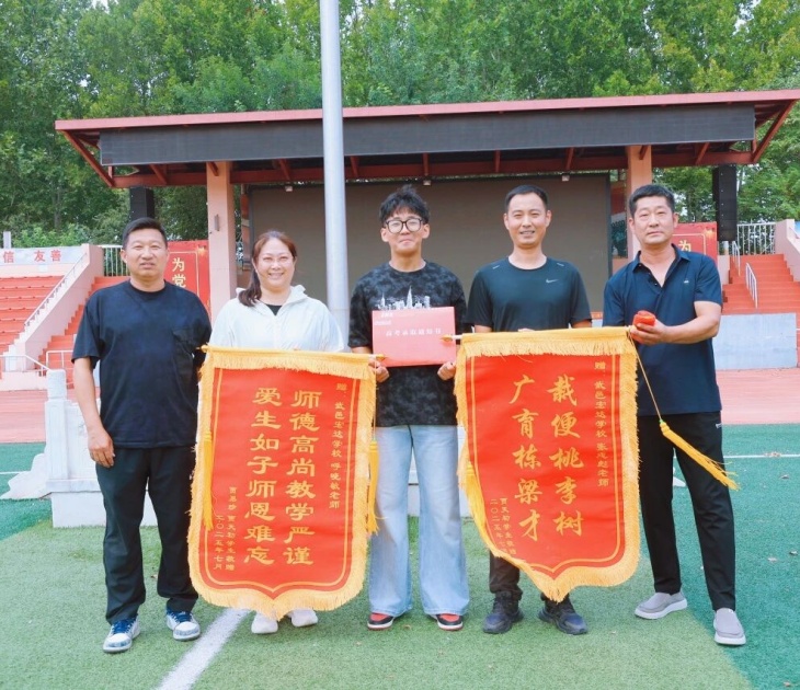 近日,我校传来振奋喜讯——体育生贾天初同学以优异成绩被北京体育大学录取!下午,贾同学与其父手捧录取通知书、两面鲜红锦旗重返母校,用最质朴的方式表达感恩。