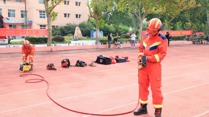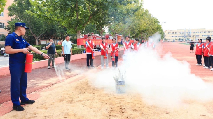 使用技能演练针对同学们最为关注的灭火器,消防员现场进行了演示“提、拔、握、压” 的正确操作步骤,并邀请同学们进行了一场有序的灭火行动。同学们沉着冷静,按照规范,对准火焰根部喷射,成功将“火势”扑灭。