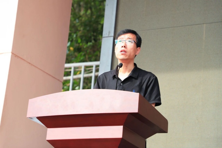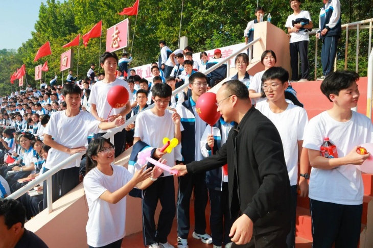 在热烈的掌声中,学校副校长金耀辉同志登台为本次运动会致闭幕词。领导首先向在赛场上挥洒汗水的运动员、公正裁决的裁判员以及辛勤付出的工作人员表示衷心的感谢。本届运动会恰逢国庆,体育精神与爱国情怀在此刻交汇融合,这次特别的国庆经历将成为宏达学子高中生活中难忘的一页。他指出运动场上的胜负是暂时的,但拼搏进取的精神是永恒的,少年的奋斗,就是献给祖国最好的生日礼物,希望同学们以更强健的体魄、更昂扬的斗志,去迎接未来的挑战,书写青春灿烂的篇章。