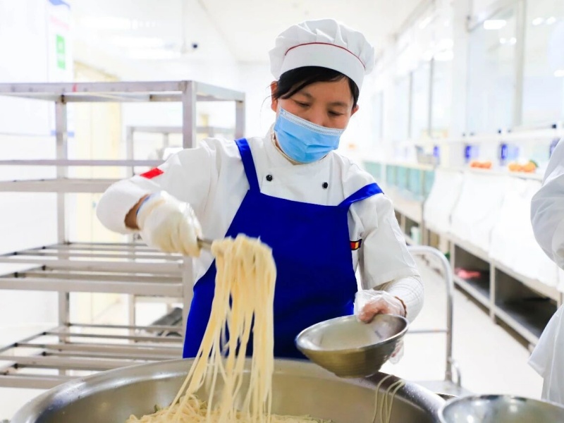 当食材遇到温度,香味便开始弥漫。科学的配比、精准的控温,锁住营养,激发本味,排风系统轻声运转,只留下了阵阵饭菜香味。美味烹制中……烹炒油炸与面食荟萃经过工作人员的精心制作,一道道美味的菜品纷纷出炉。