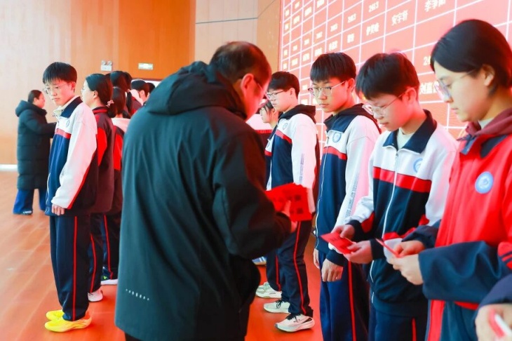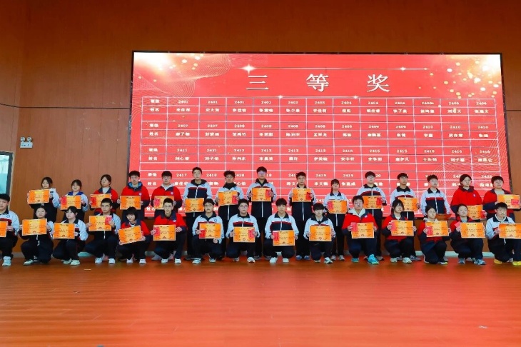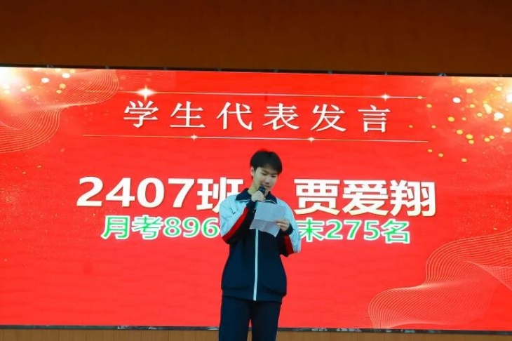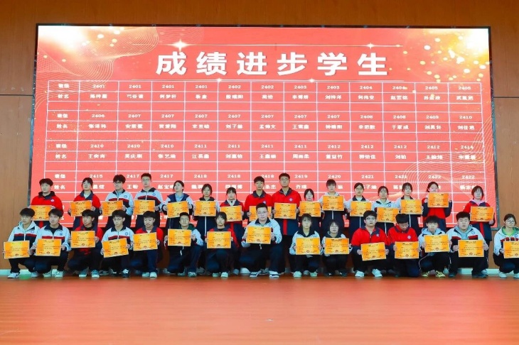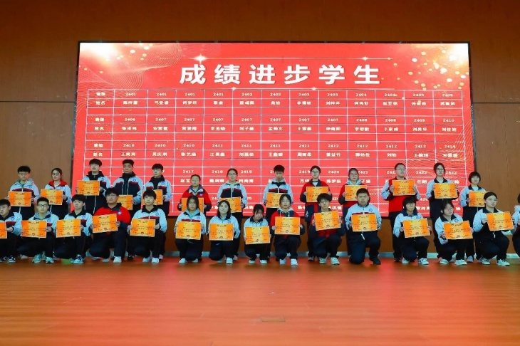 颁奖环节是本次大会的高光时刻,表彰奖项覆盖学生、教师、学科组、班级、级部等多个维度,一个个荣誉的揭晓,一次次热烈的掌声,见证着每一位奋斗者的汗水与荣光。成绩优秀学生分批次登台领奖,一等奖、二等奖、三等奖的获得者们,以勤学善思书写青春答卷,成为全体同学的学习标杆;成绩进步学生们更是让人眼前一亮,其中2407班贾爱翔同学从月考的896名跃升至期末275名,进步621名,用坚持与努力诠释了“突破自我”的深刻意义。