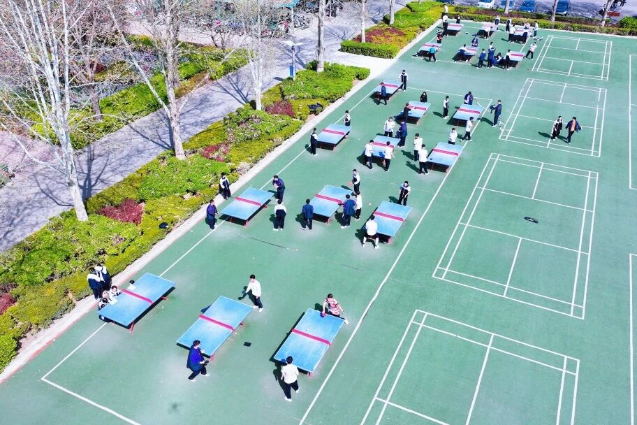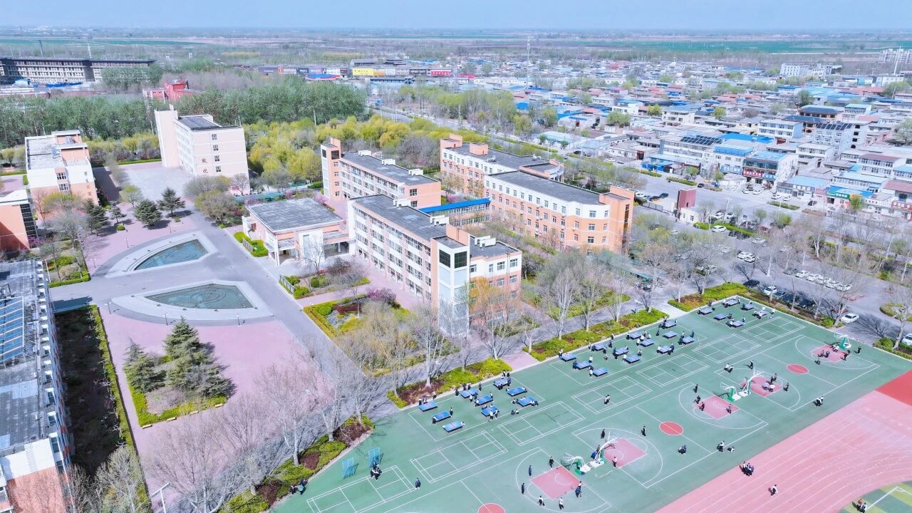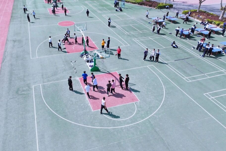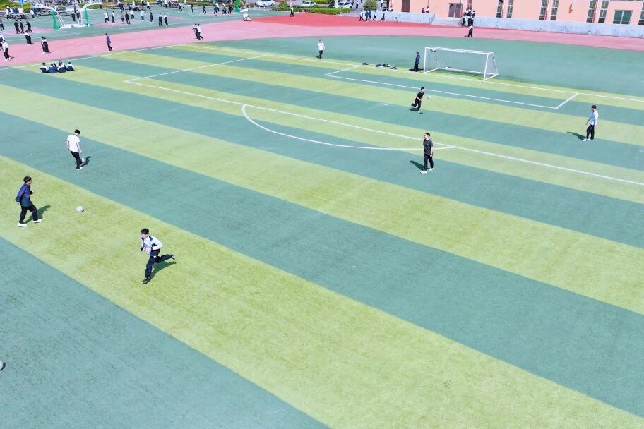 转至操场,色彩骤然鲜活。跑道上奔跑的身影划出青春的弧线,足球场上跃动的少年挥洒汗水,篮球架下传来清脆的击球声。从空中俯视,这片开阔之地如同校园的心脏,每一次跳动都充满力量。成群的学生在草坪上铺展开,笑声与呐喊随风升腾——这是属于春天的律动,更是属于青年的宣言:风华正茂,不负韶光。